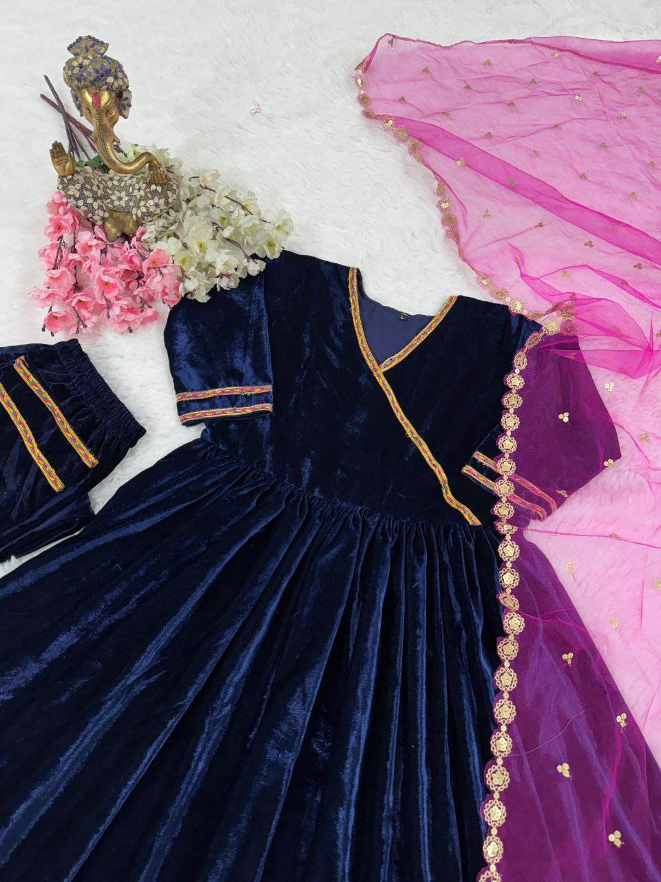 A Pure 9 Thousand Velvet With Embroidery Work Gown