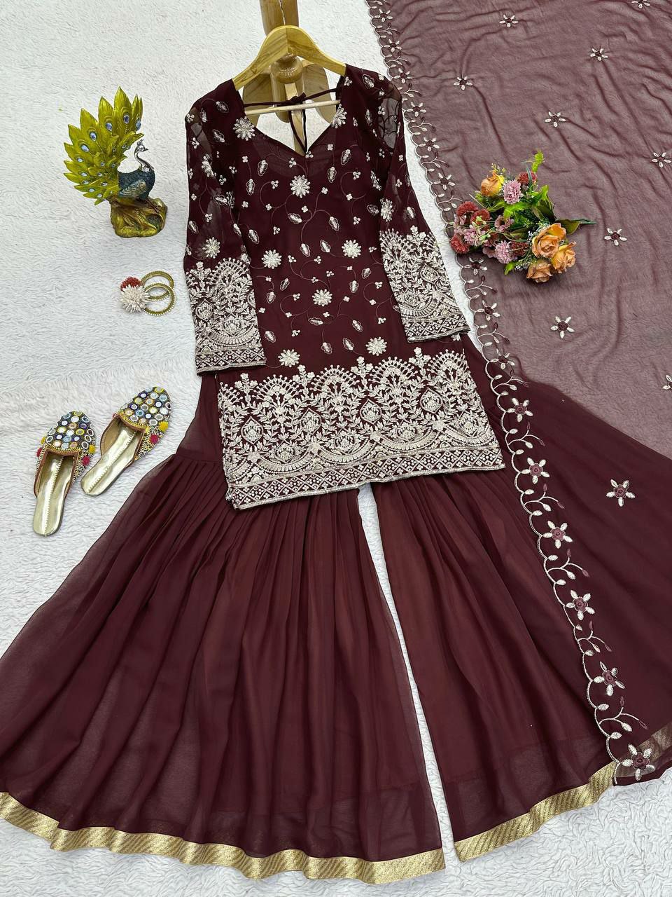 Brown Sharara And Kurta Pair In Faux Georgette For Wedding Season