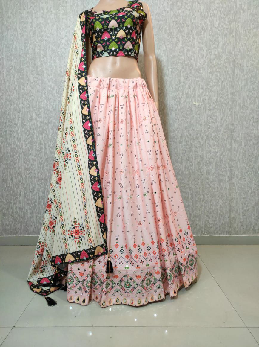 Heavy Butter Silk With Beautiful Hand Print With Real Mirror Work Lehenga Choli