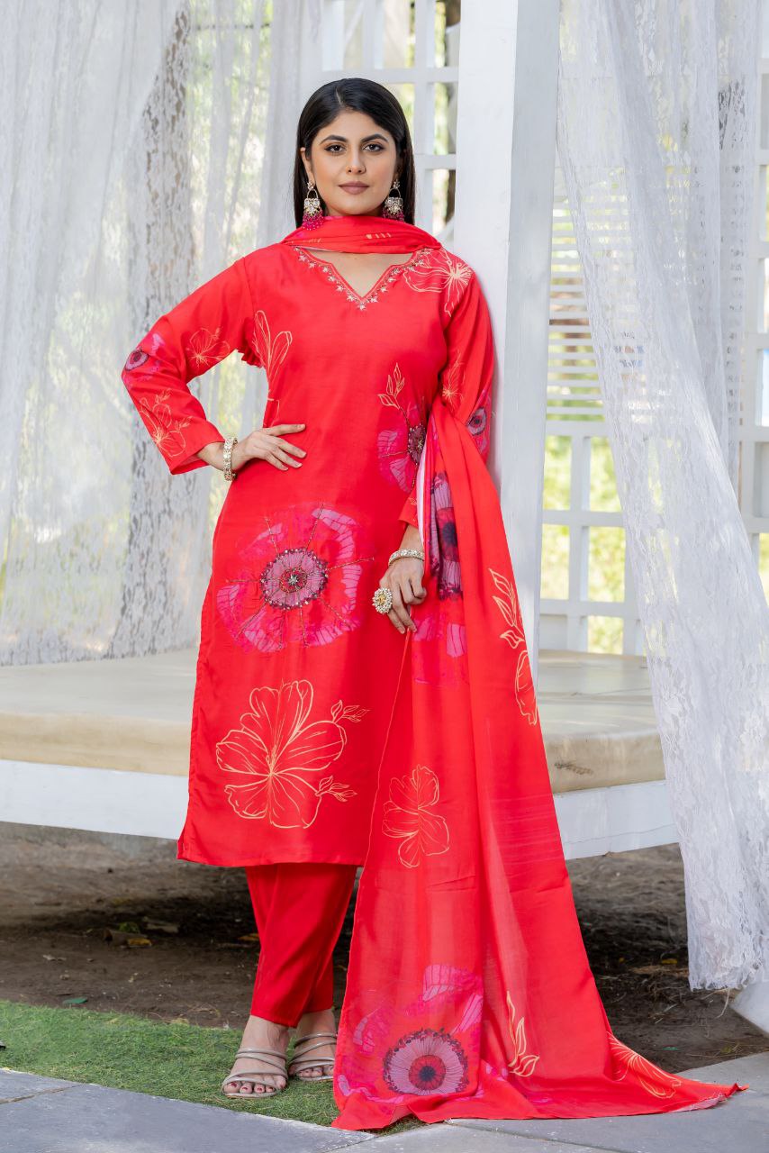 Heavy Handwork Detailing on Red Floral Printed Kurti