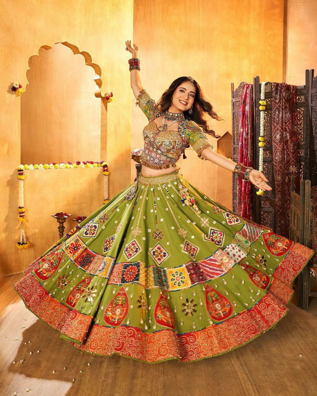 Heavy Muslin Cotton With Beautiful Digital Print With Real Mirror Work & Kodi Work & Fancy Coin Lace Lehenga Choli