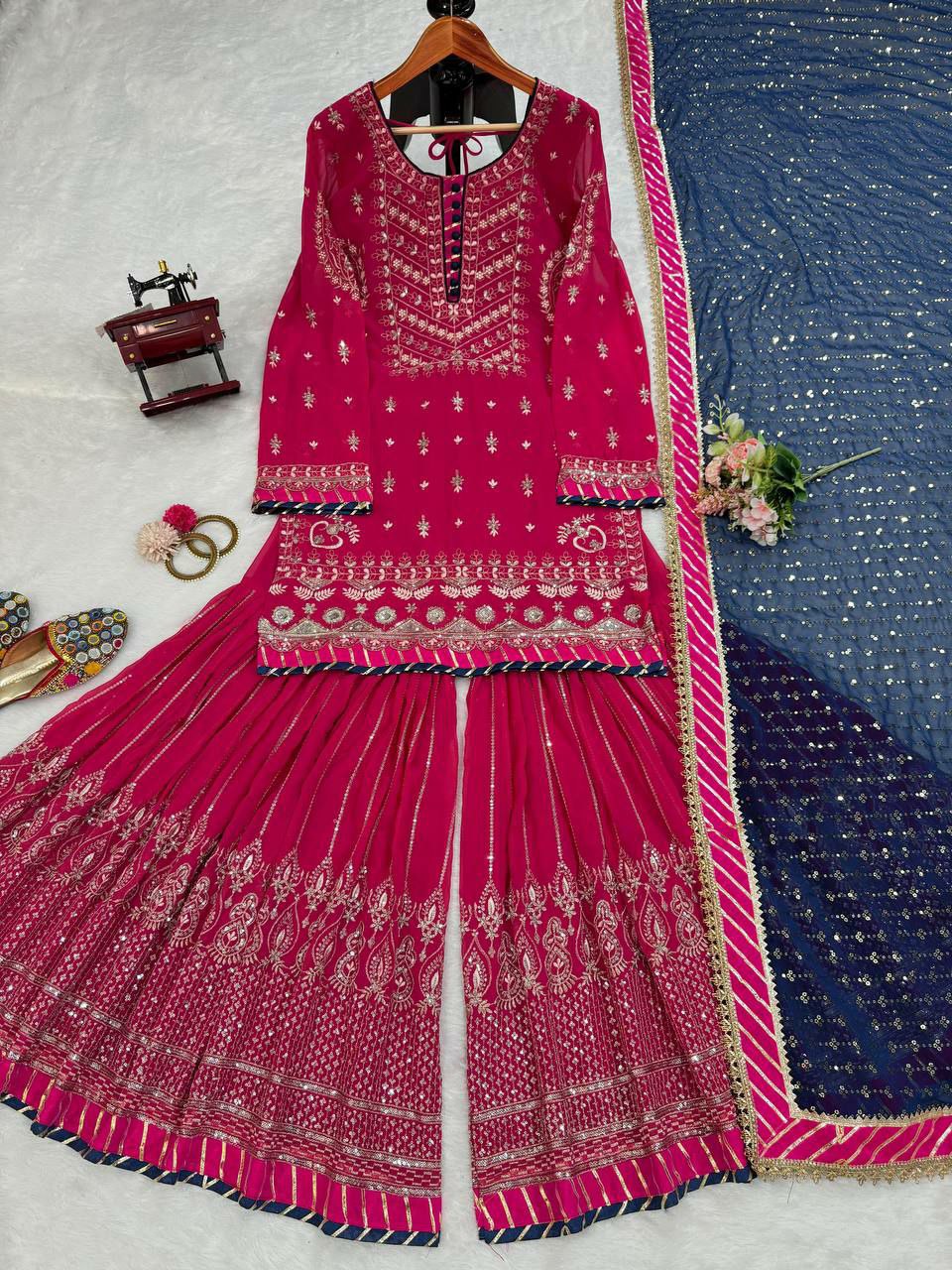 New Embroidery Faux Georgette Kurti And Sharara Set For Women For Wedding