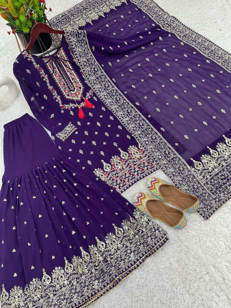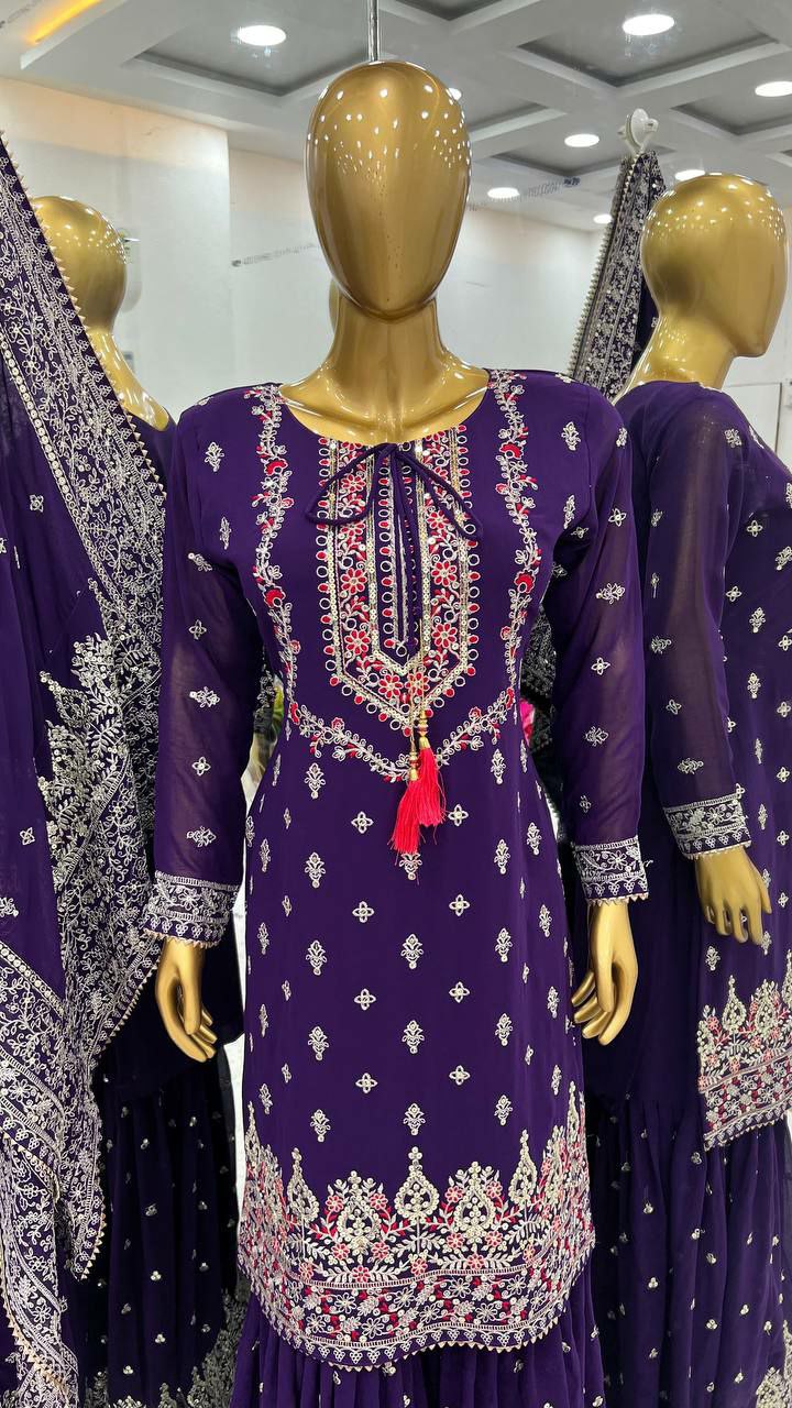 Pure Heavy Chinon Silk With Embroidery Sequence Work with Sleeve Navy Blue Sharara