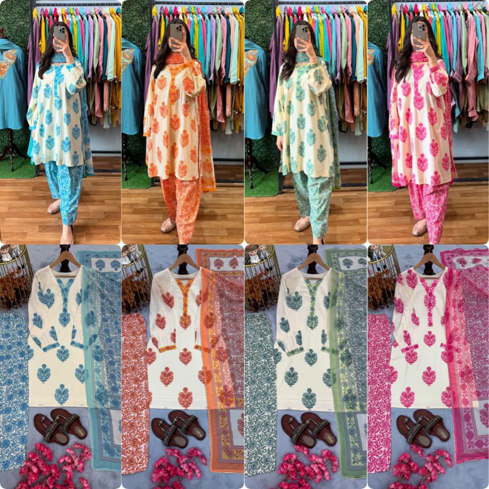 Pure Maslin Cotton With Digital Print With Elastic And Four Side Readymade Lace Border Farshi Palazzo Dress