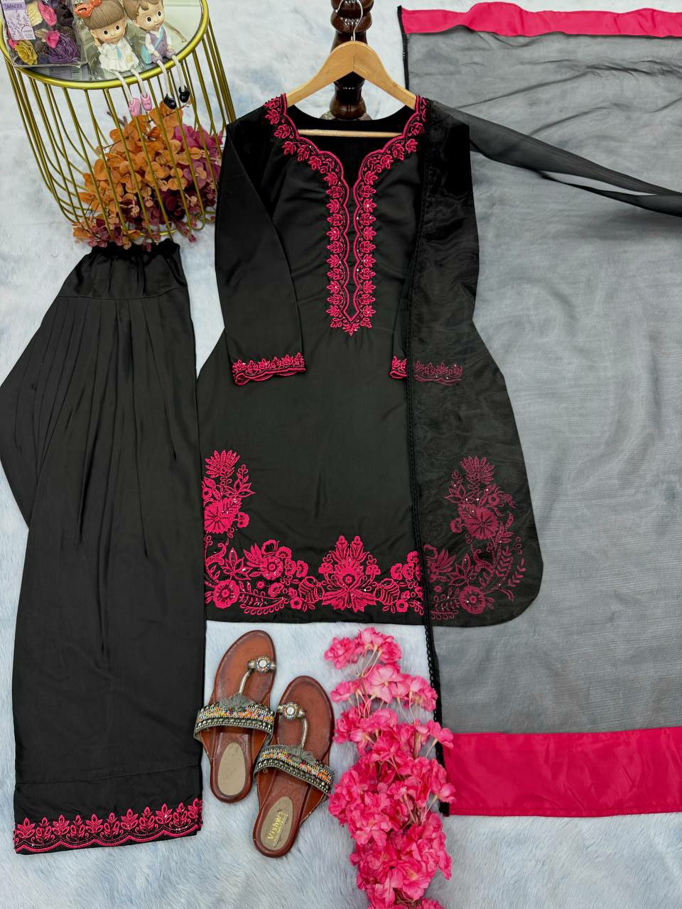 Pure Natural Crepe With Bidas Val Moti & Embroidery Sequence Work With Elastic And Ready made Less Border With Patta Farshi Palazzo Dress