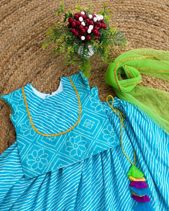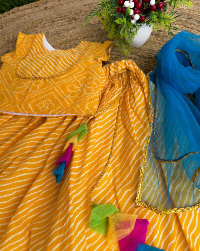 REYON PRINTED LEHERIYA WITH BANDHEJ FULL FLAIR SKIRT WITH BELT ATTACHED