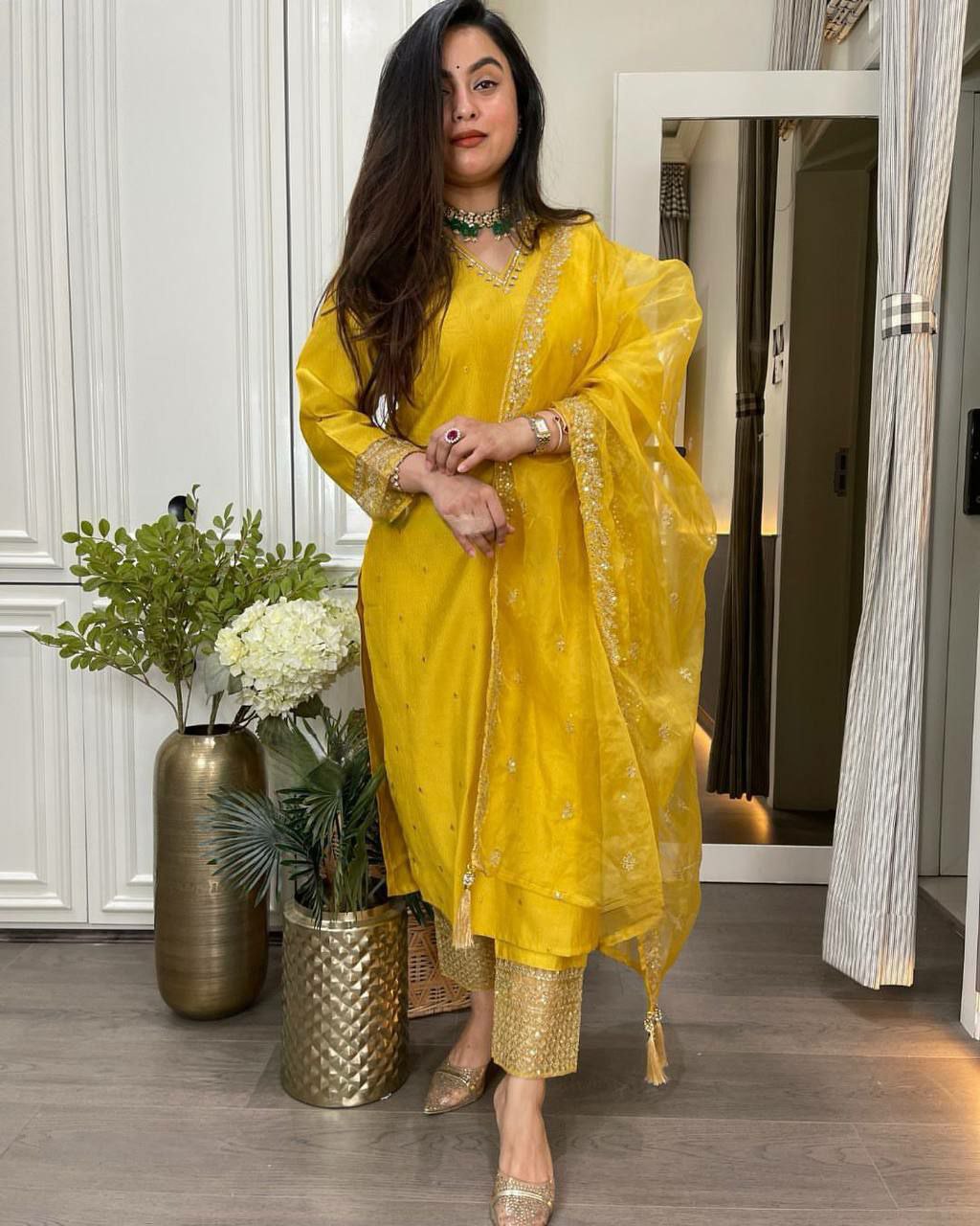 FABRIC : ORGANZA WITH SEQUENCE EMBROIDERY WORK,LACE ON BORDER AND LATKAN ON CORNER