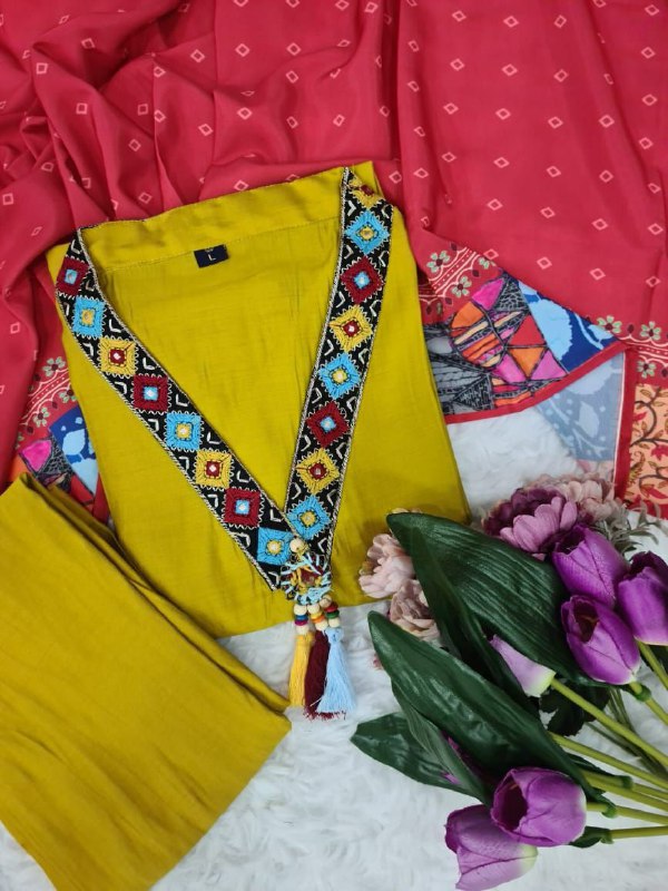 YELLOW ROMAN SILK WITH HAND WORK KURTI