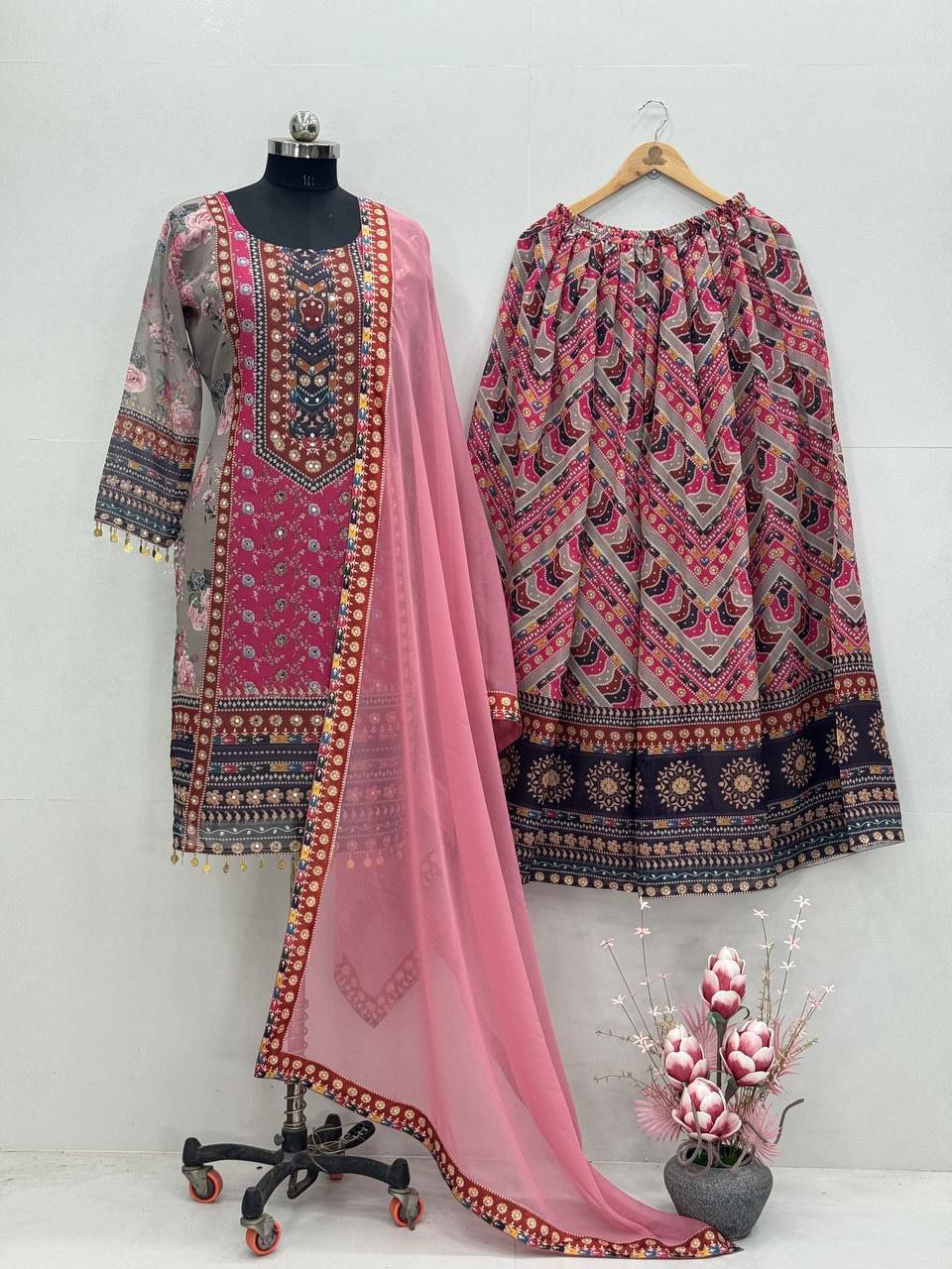 HEAVY FAUX GEORGETTE AND DIGITAL PRINT WITH REAL MIRROR HAND WORK AND SHIKA LESS & DIGITAL PRINT LESS BORDER TOP & PALAZZO