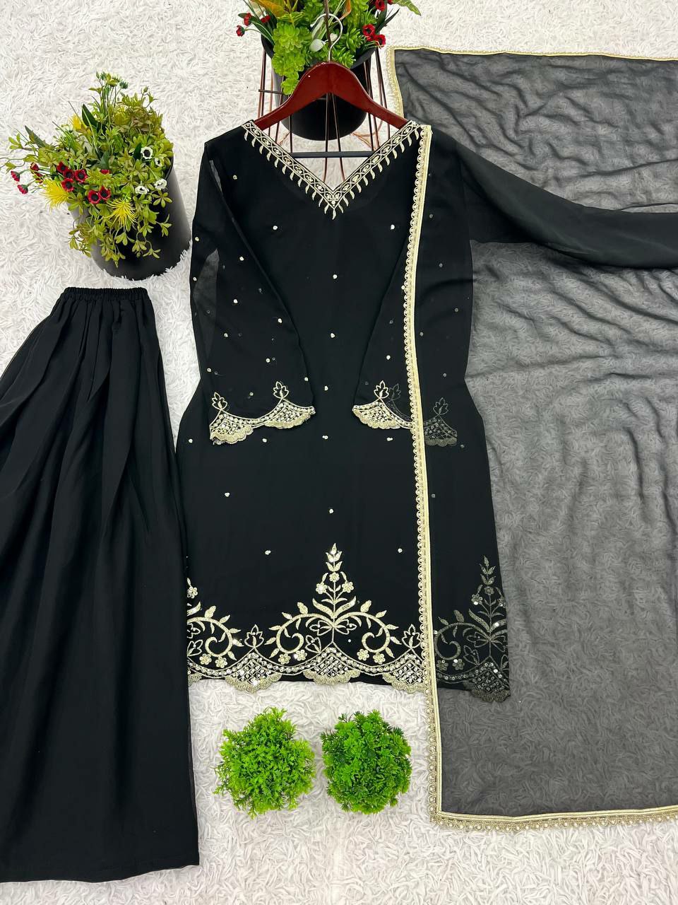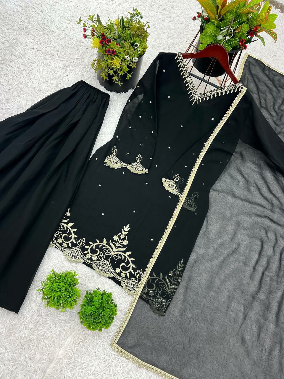 Palazzo Fabrics : Heavy Faux Georgette With 5mm Embroidery Sequence With Fully Flair