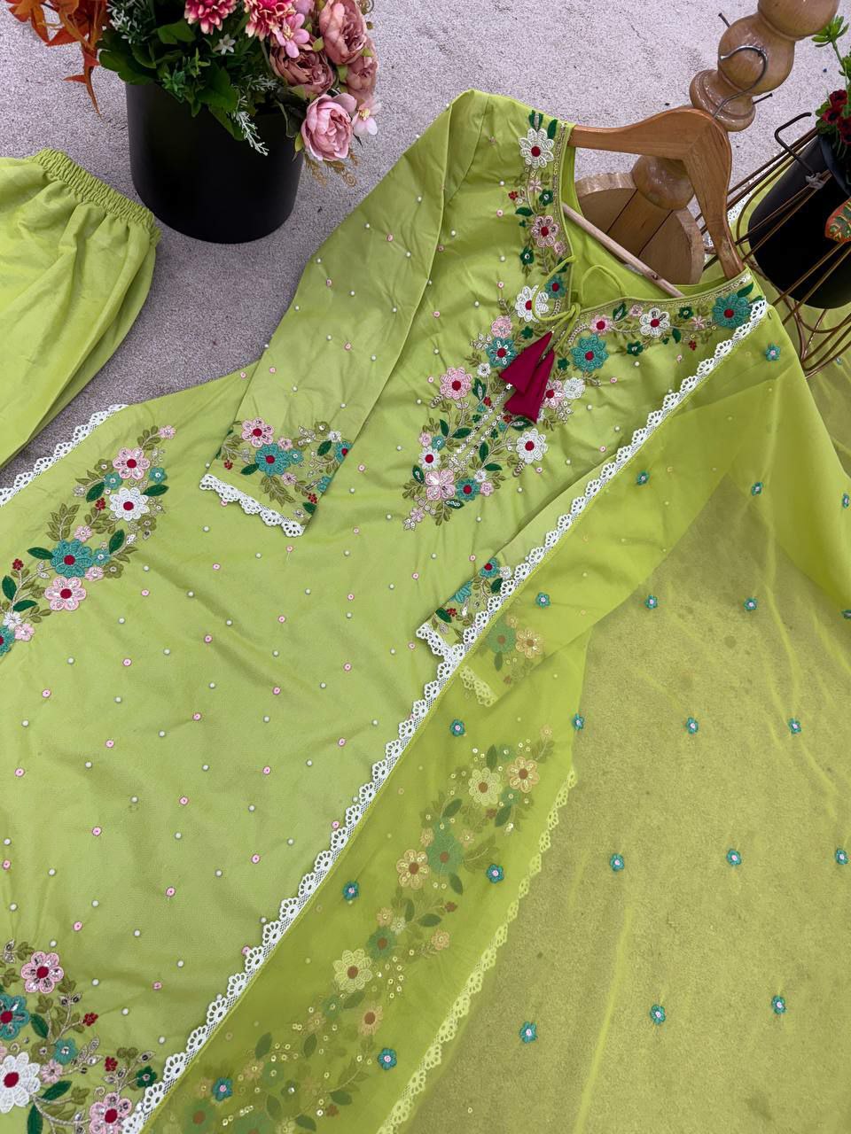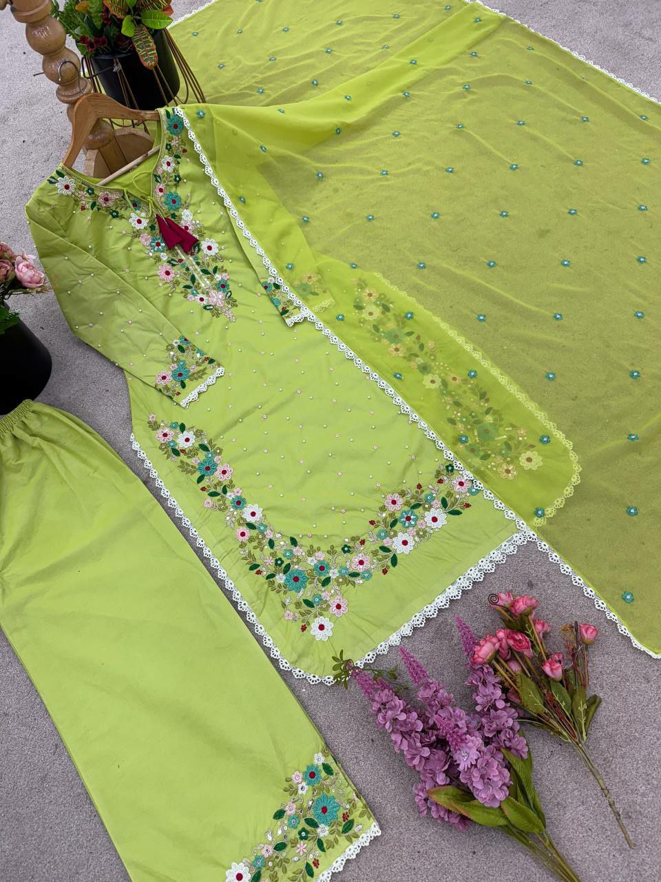 Heavy Faux Georgette With Heavy Micro Cotton And Embroidery Sequence Work And Lace Border Palazzo Dress