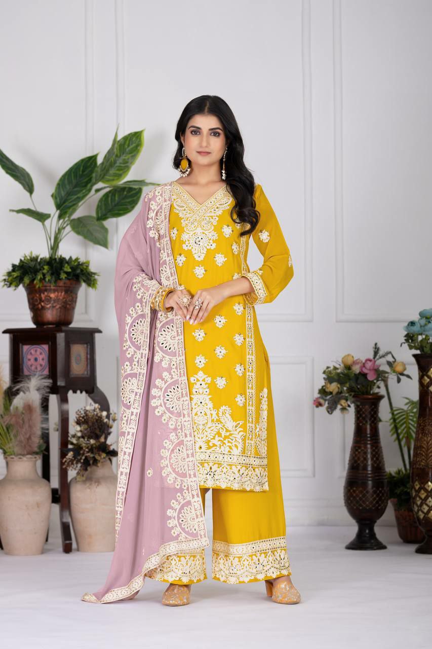 HEAVY FUAX GEORGEET AND EMBROIDERY SEQUENCES WORK WITH REAL MIRROR HAND WORK PALAZZO DRESS