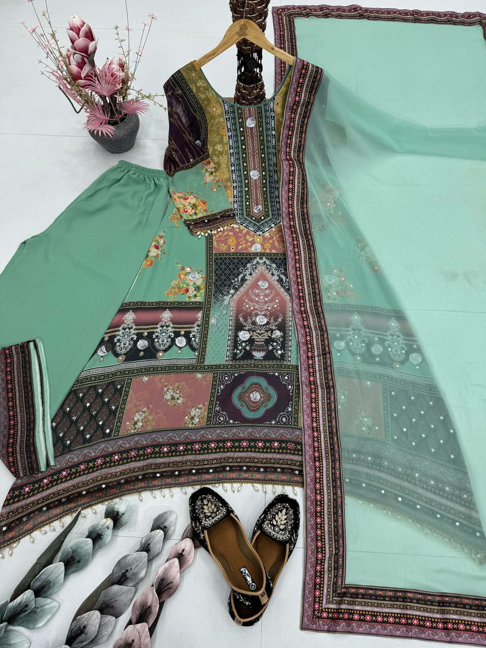 HEAVY FUAX GEORGETTE AND DIGITAL PRINT WITH REAL MIRROR & READYMADE CHAKRI HAND WORK WITH FANCY LESS TOP & PALAZZO