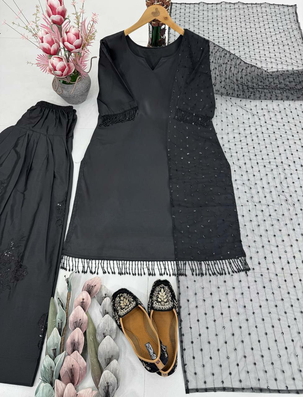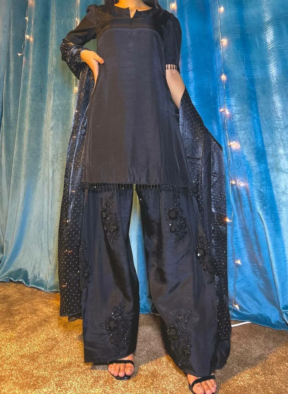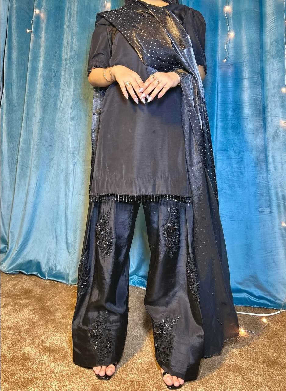HEAVY NATURAL SILK WITH EMBROIDERED SEQUENCE WORK AND FANCY LESS BODAR FARSHI PALAZZO DRESS