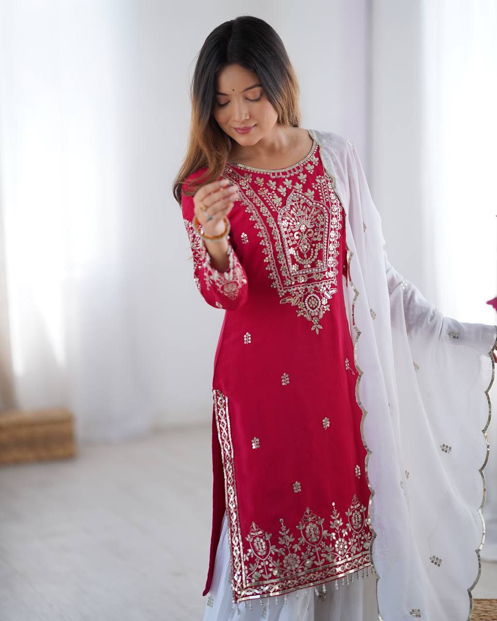 Top Fabric : Heavy Pure Chinon With 5mm Embroidery Sequence Work With Full Sleeve