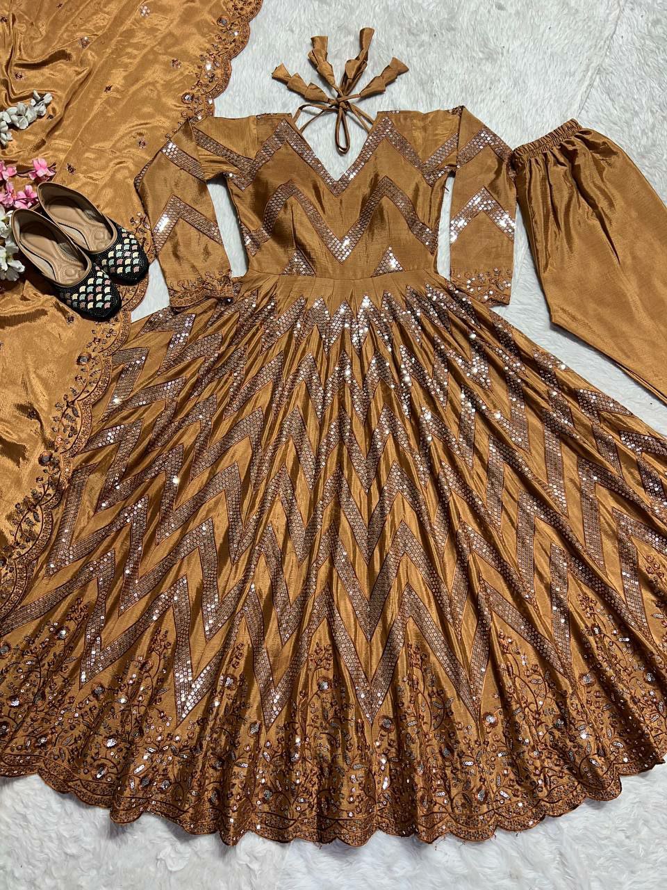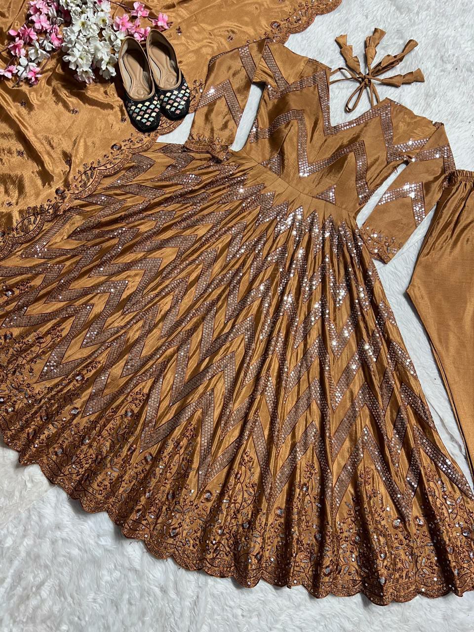 Heavy Pure Chinon Silk And Sequence Embroidery Work With Fancy Full Sleeves Bordar Anarkali Dress