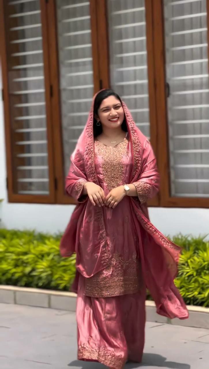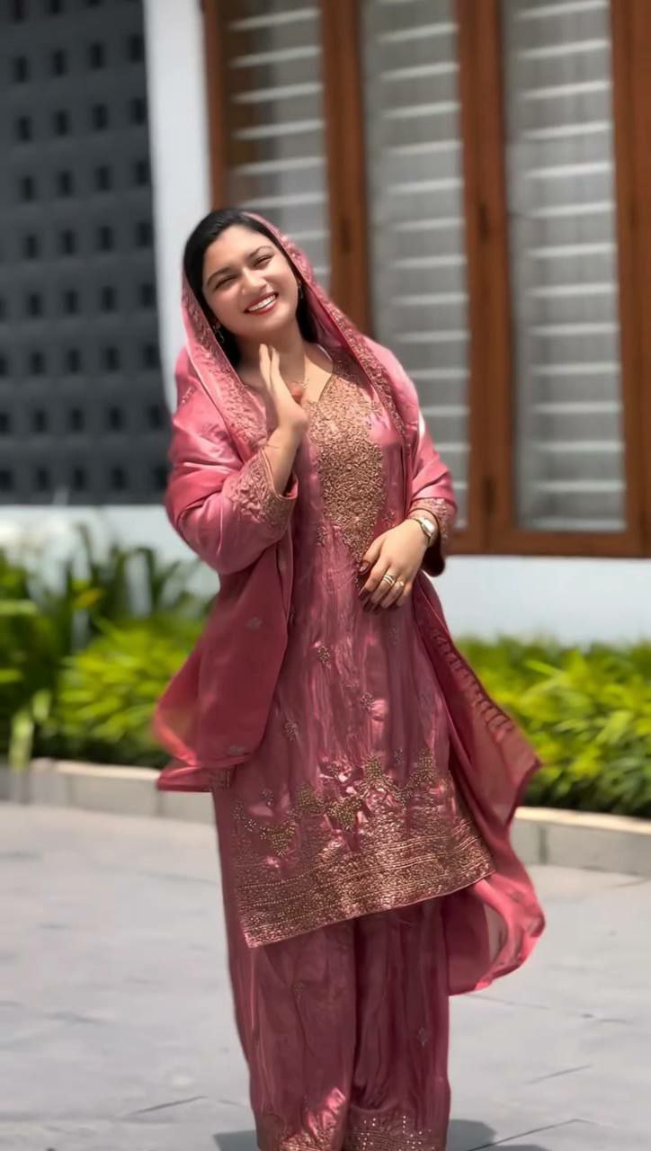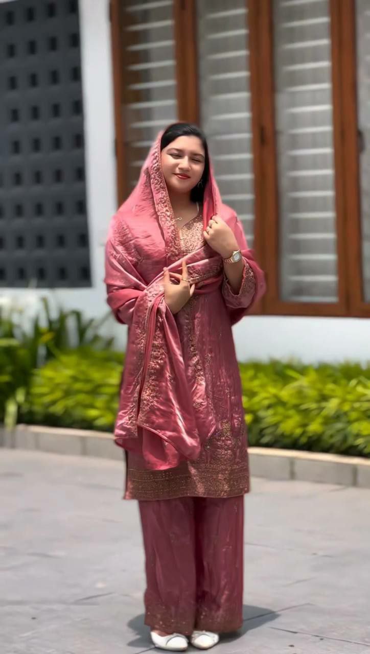 Pure Chinon Silk With Heavy Micro Cotton And Heavy Embroidery And Sequence Work With Palazzo Dress