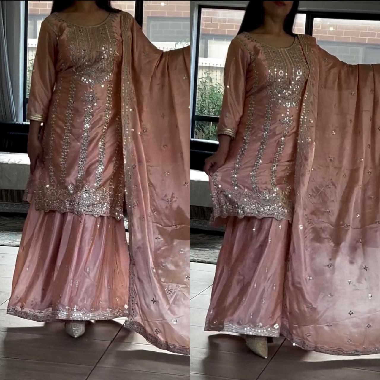 Pure Heavy Chinon Silk And Heavy Embroidery Work With Fancy Borders Less Work Fully Flair Sharara Palazzo Dress
