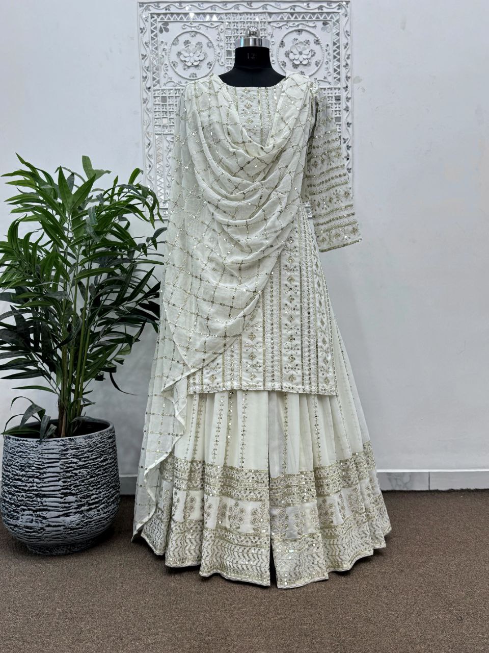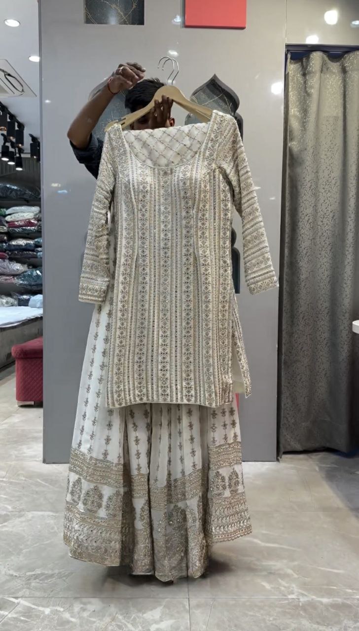 faux Georgette And Full Sleeve With Work White Kurti Set