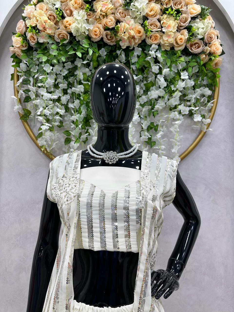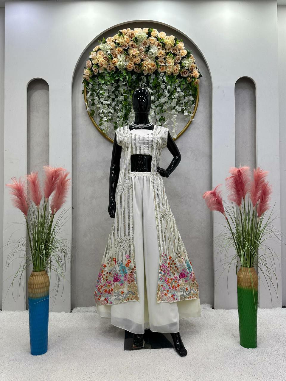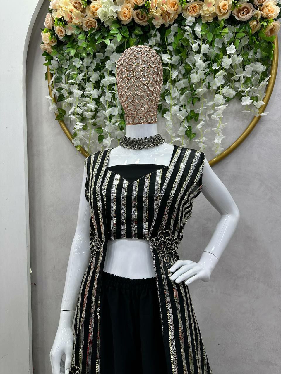 Shrug Fabric : Foux gorgette Inner : Micro Work. : thread with Sequnce Stich : Full stich upto XL(42) Choli Fabric : Foux gorgette Work : thread with sequnce Stich : Unstich upto 42 Plazo Fabric : Foux gorgette Stick : Full stich upto 42 with elastic
