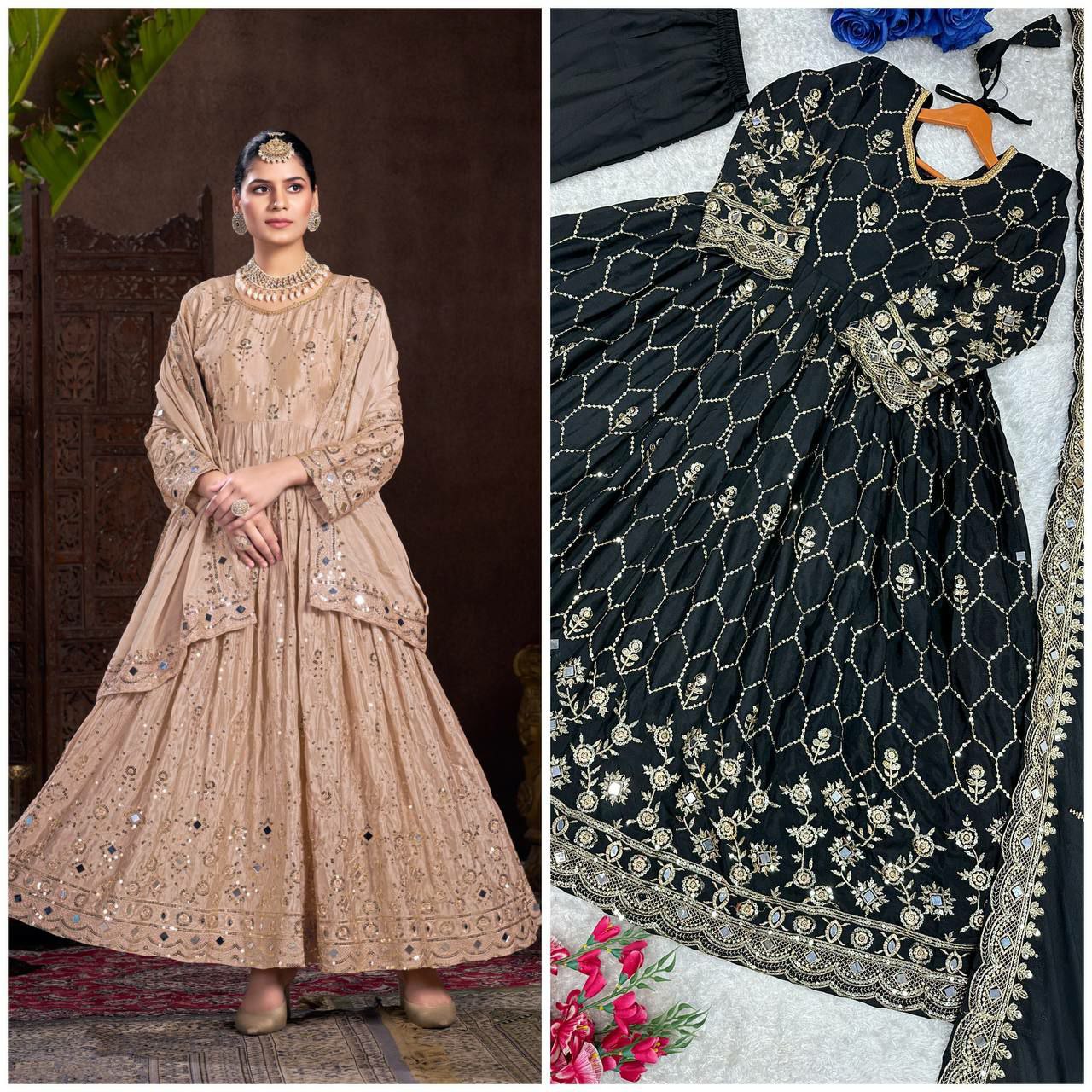 HEAVY CHINON SILK WITH EMBRODARY WORK WITH FULL SLEEVES AND REAL MIPRROR WORK GOWN