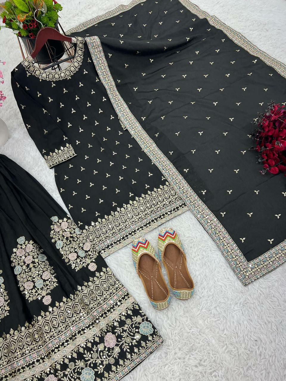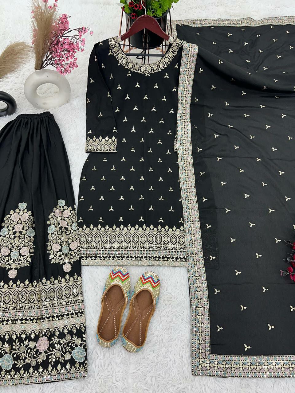 Fabric Detail Top Top Fabric : Heavy Chinon Silk With Malty Thread Embroidery Sequence Work with Sleeve new Fancy Wear Top Inner : Heavy Micro Cotton Top Length : 40-41 Top Size : M(38) L(40) XL(42) AND XXL(44)* (Fully Stitched Complete Ready To Wear) Sharara Sharara Fabrics : Heavy Chinon Silk With Embroidery Sequence Work With Flair Sharara Length : 40-41 Inch (fully stitched) Dupatta Dupata Fabric : Heavy Chinon Silk With Malty Thread Embroidery Sequence Work and Lace Border