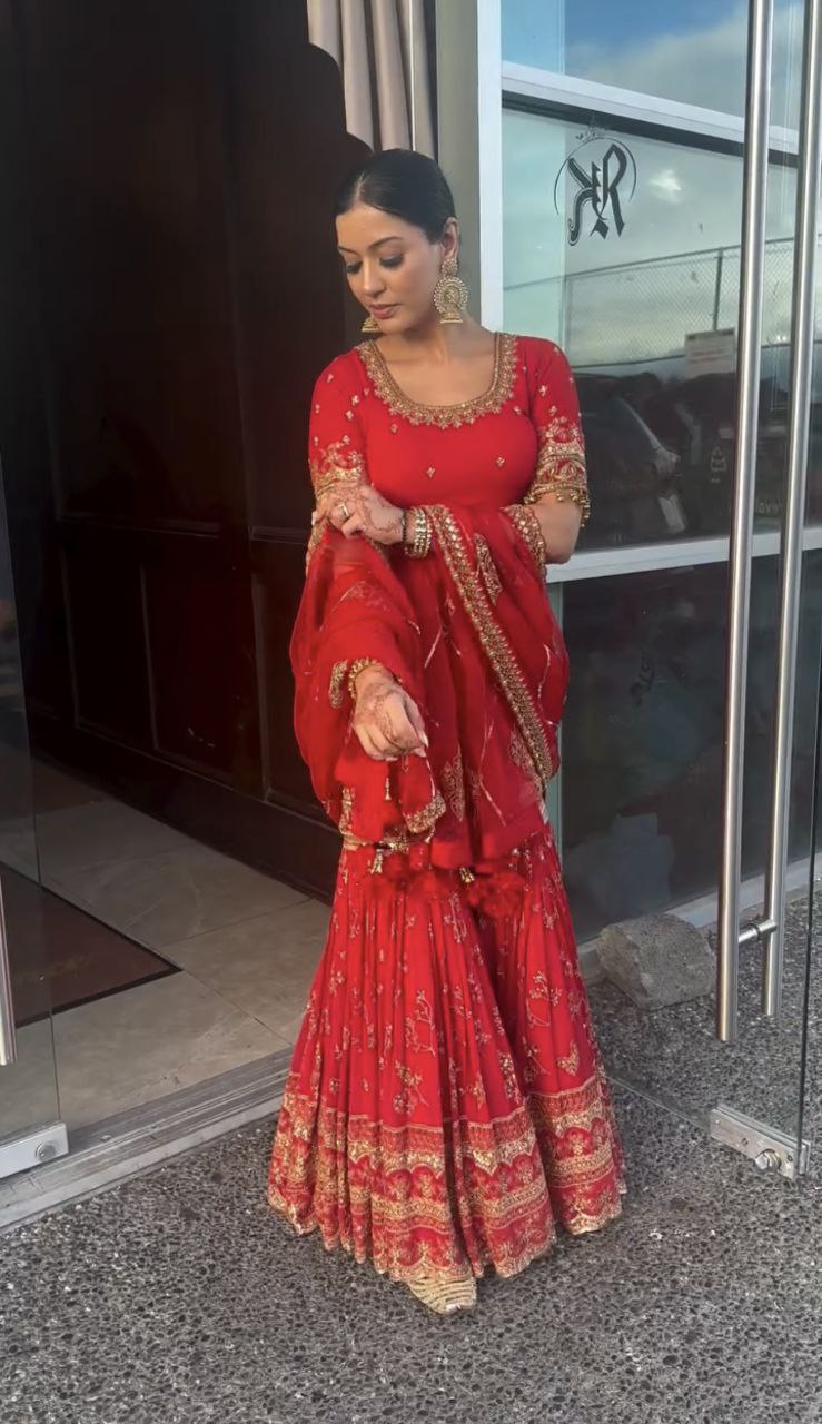 Fabric Detail Top Fabric : Heavy Faux Georgette Material With 5mm Sequence Embroidery Work. with  Long Sleeves Red Shararaa Top Inner : Micro Cotton Top Size : M(38),L(40),XL(42),2XL(44) + Margin (Fully Stiched ) Top Length : 37-38 Inches Sharara Palazzo : Heavy Faux Georgette Material With 5mm Sequence Embroidery work. (Fully Stiched Sharara Palazzo Styles and Length is 41-42) Palazzo Inner : Micro Cotton Dupatta Fabric :- Heavy Butterfly Net Material With Embroidery 5mm Sequence Work and Fabcy Lees Dupatta Length : 2.30 mtr Package Contain :- Top, Sharara Plazzo and Dupatta
