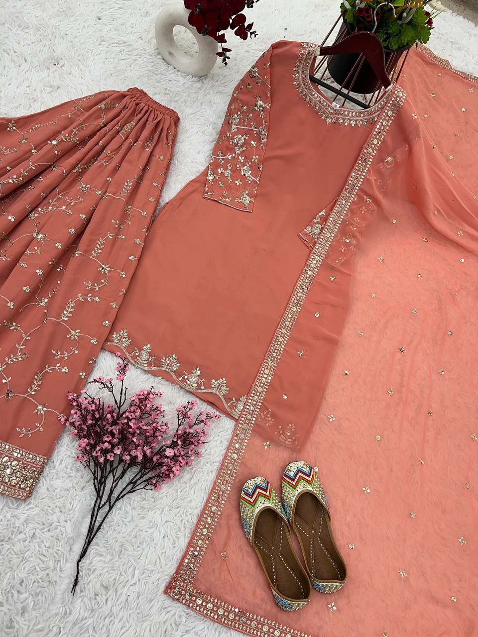 Heavy Faux Georgette With 5mm Embroidery Sequence Work With Full Sleeve Kurti Set