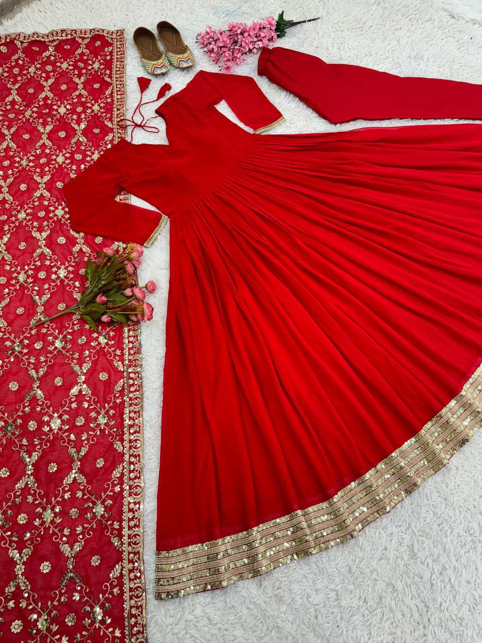 Heavy Faux Georgette With Full Heavy Embroidery Sequence Work with Sleeve Red Gown