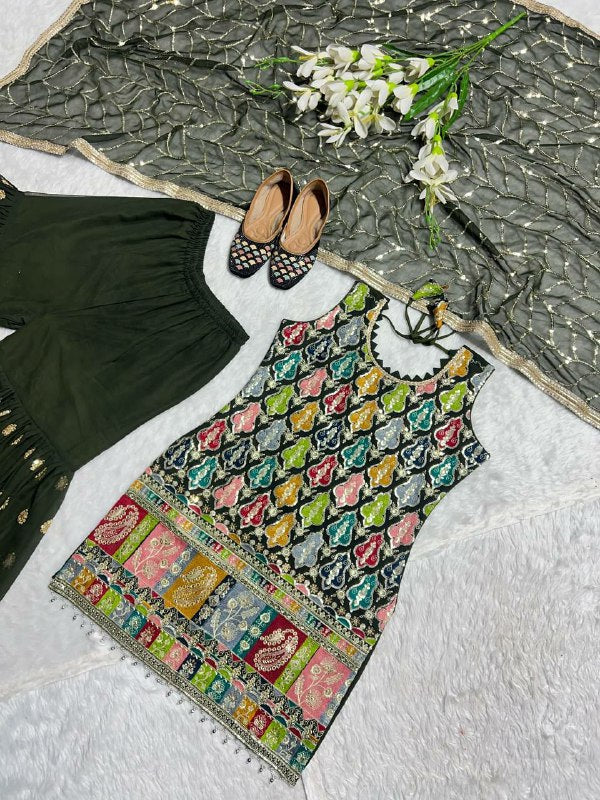 Top Fabric :- Heavy Faux Georgette With Heavy 3mm Embroidery Sequence Work With Full Sleeve With Latkan Dori Green Heavy Sharara Set