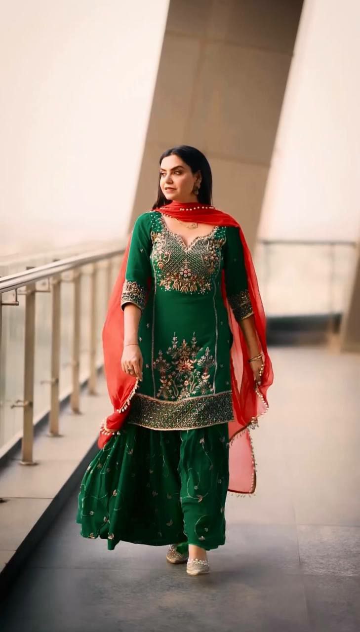 HEAVY FAUX GEORGETTE . WORK : BEAUTIFUL EMBROIDERY SEQUENCE WORK SHARARA PAIR