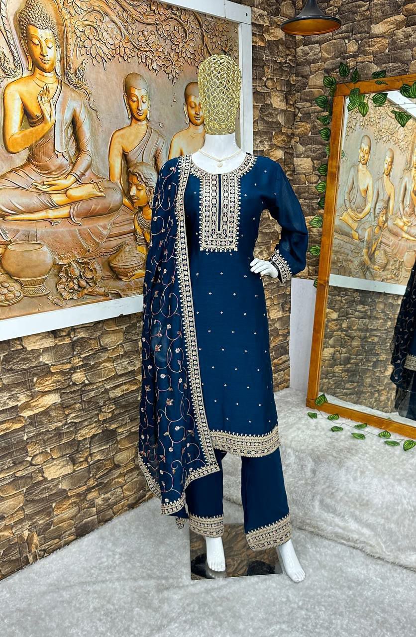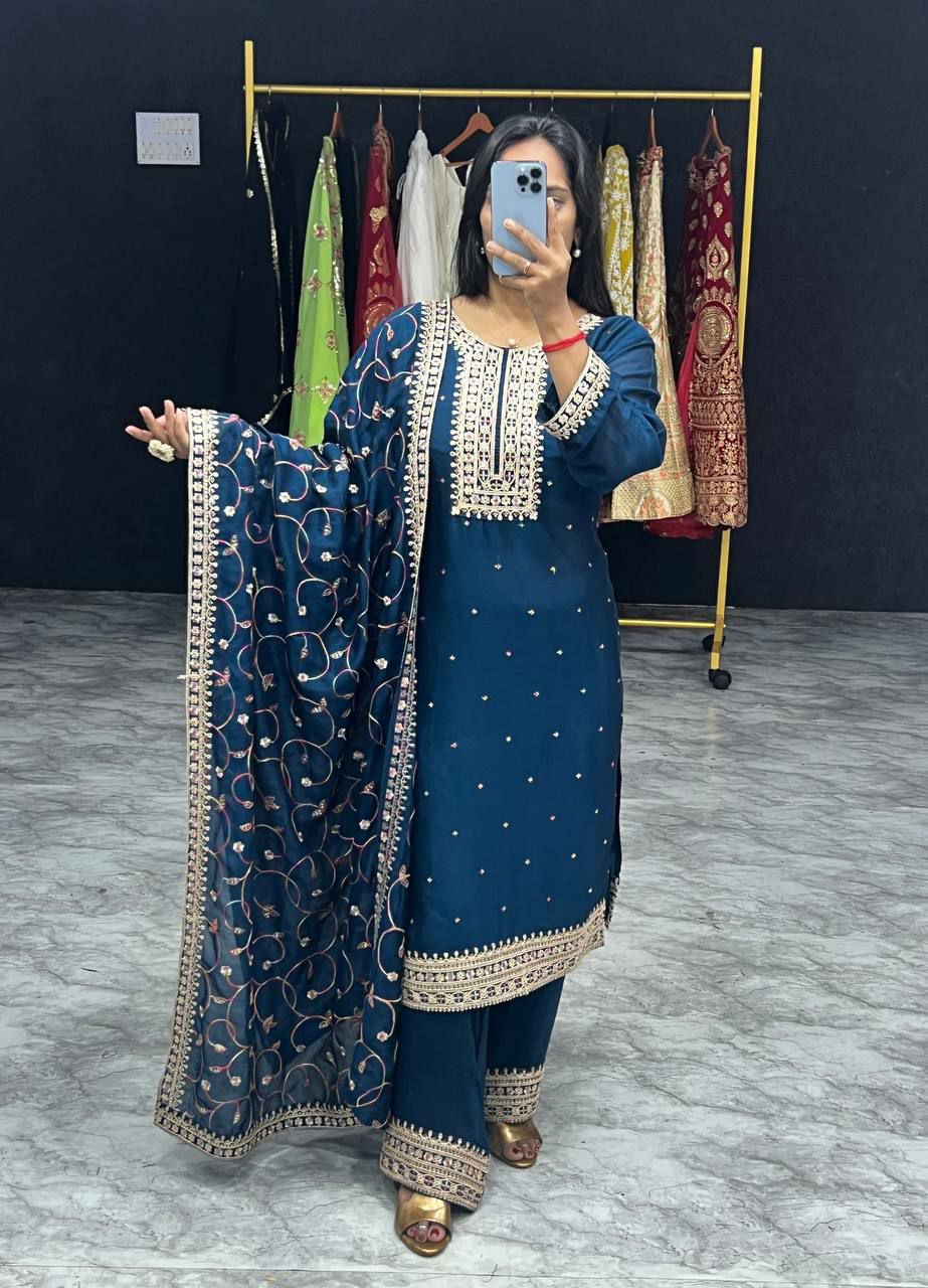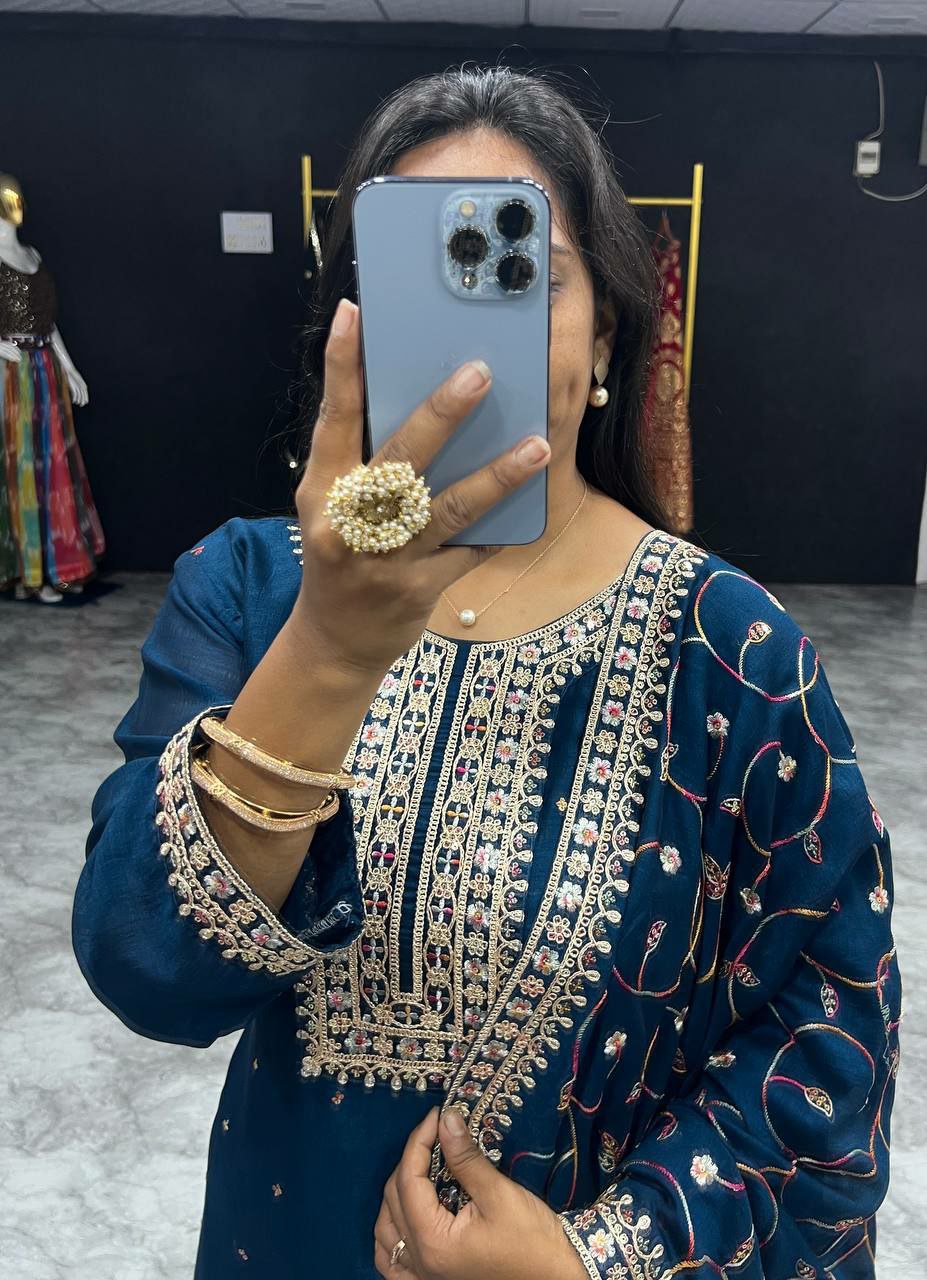 HEAVY VICHITRA SILK WITH HAVY EMBROIDERY WORK BLUE FLAIR KURTI