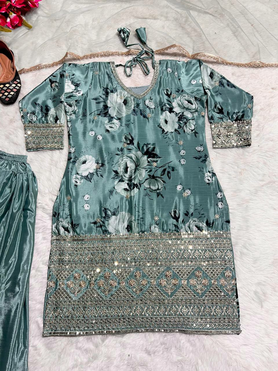 Hevay Pure Chinon Silk With Heavy Embroidery 5mm Sequence Work And Digital Print. (Fully Sleeve’s) Kurti And Sharara Pair