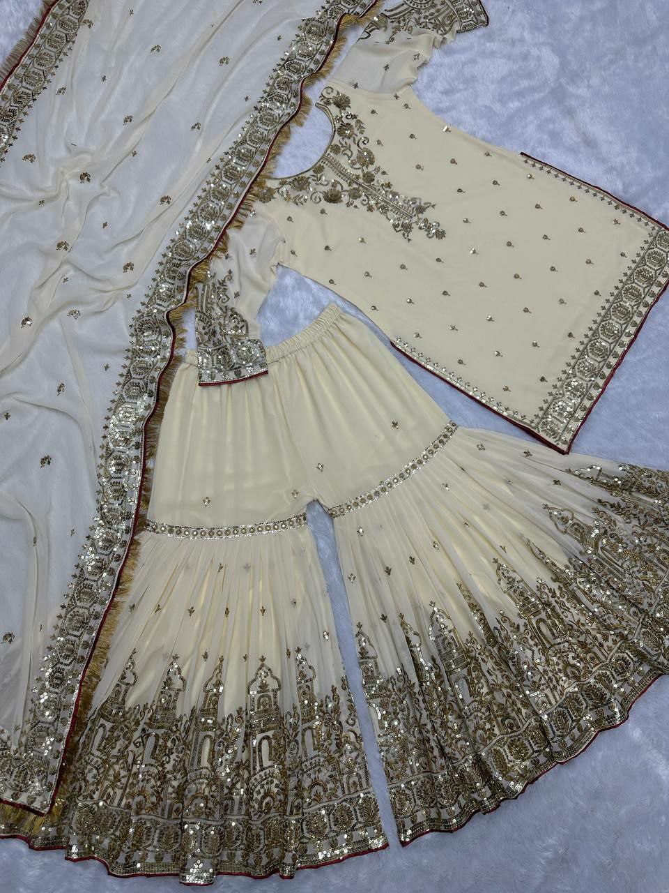 Fabrics Details Top Top Fabric : Faux Georgette Top Inner- : Micro Cotton Top Work : Heavy Embroidery And 5mm Sequins Work And Contras Fabric Piping (Only Front Side Work) Top Length : 36 Inc Top Size : 42 XL Free Size XXL Margin Sharara Sharara Fabric : Faux Georgette Sharara Work: Heavy Embroidery And 5mm Sequins Work And Contras Fabric Piping Sharara Inner : Micro Cotton Sharara Length : 40-42 Inc Up To XXL Dupatta Dupatta Fabric : Faux Georgette Dupatta Work : Heavy Embroidery And 5mm Sequins Work With Contras Fabric Piping And Fancy Lace Border Dupatta Length : 2.10 Mtr