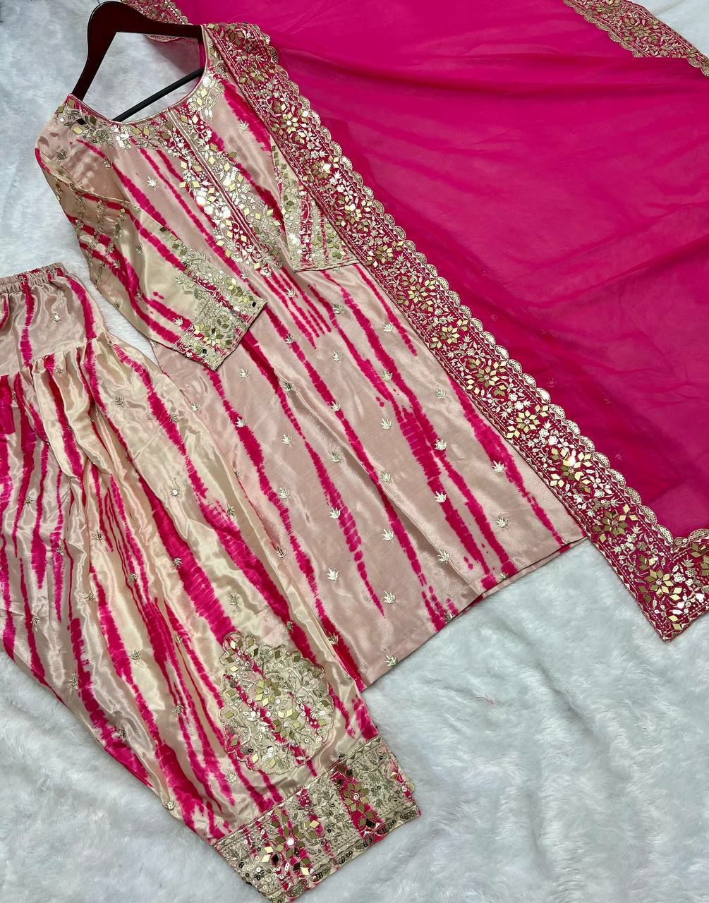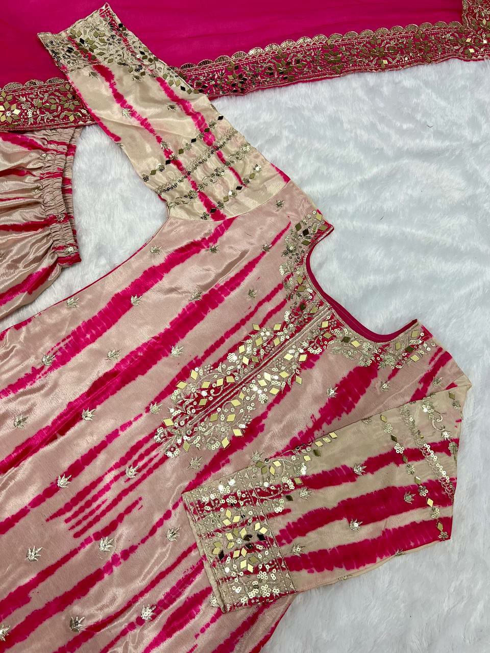 Pure Chinnon Silk With Digital Print and Heavy Embroidery Sequence Work With Real Mirror Work And Full Sleeve Kurti