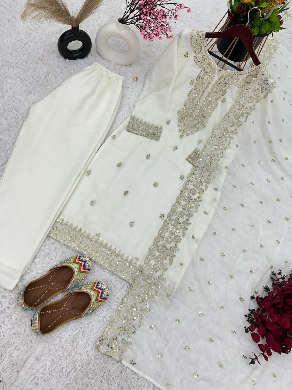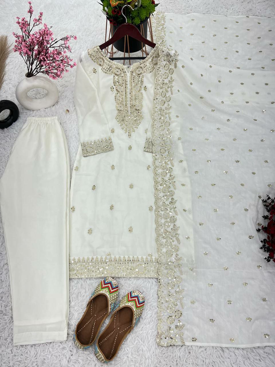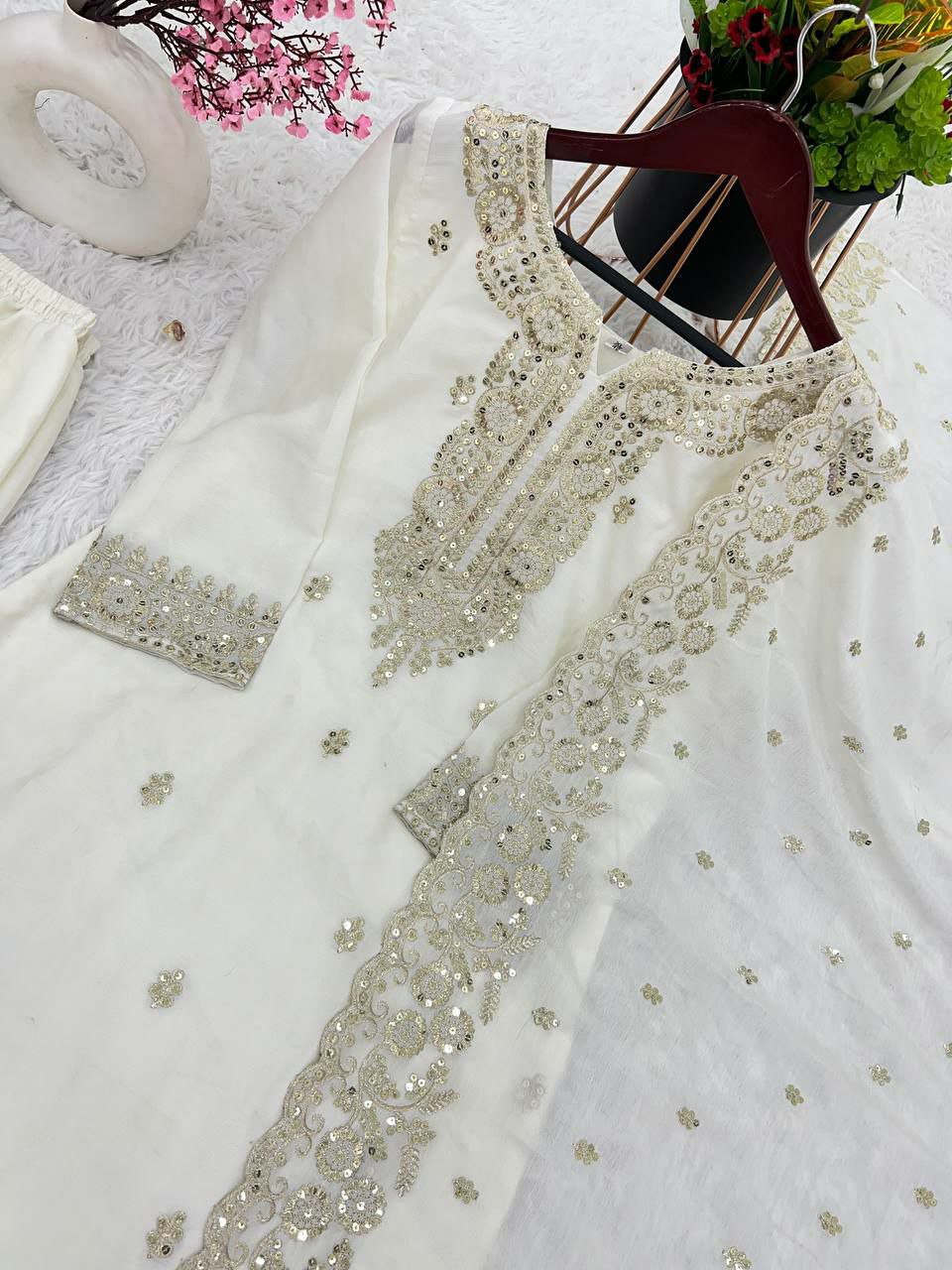 Fabric Detais Top Top Fabric -Pure Chinnon Silk With Full Sleeve White Kurti Set Top Inner : Heavy Micro Cotton Top Length: 41-42 Inch Top Size- M(38),L(40),XL(42),XXL(44) (FULLY STITCHED READY To WEAR) Bottom Bottom Fabrics : Pure Chinnon Silk With Elastic Bottom Inner : Heavy Micro Cottn (Free Size Up To Xxl(44) (Full stitched) Bottom Length : 40-41 Inch Dupatta Dupatta Fabric : Pure Chinnon Silk With Embroidery Sequence Work