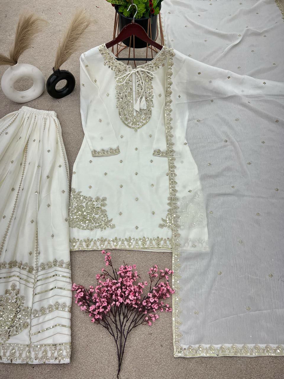 Fabric Detail Top Top fabric :Pure Chinnon Silk With Heavy Embroidery Sequence Work And Full Sleeve Sharara Top Inner :Heavy Micro Cotton Top Length : 38-39 Inch Top Size : M(38),L(40), Xl(42), Xxl(44) (FULLY STITCHED READY TO WEAR) Gharara Gharara Fabrics :Pure Chinnon Silk With Heavy Embroidery Sequence Work With Elastic (Full stitched) Gharara Length : 40-41 Inch (fully stitched) Dupatta Dupatta Fabric :Pure Chinnon Silk With Embroidery Sequence Work With Lace Border