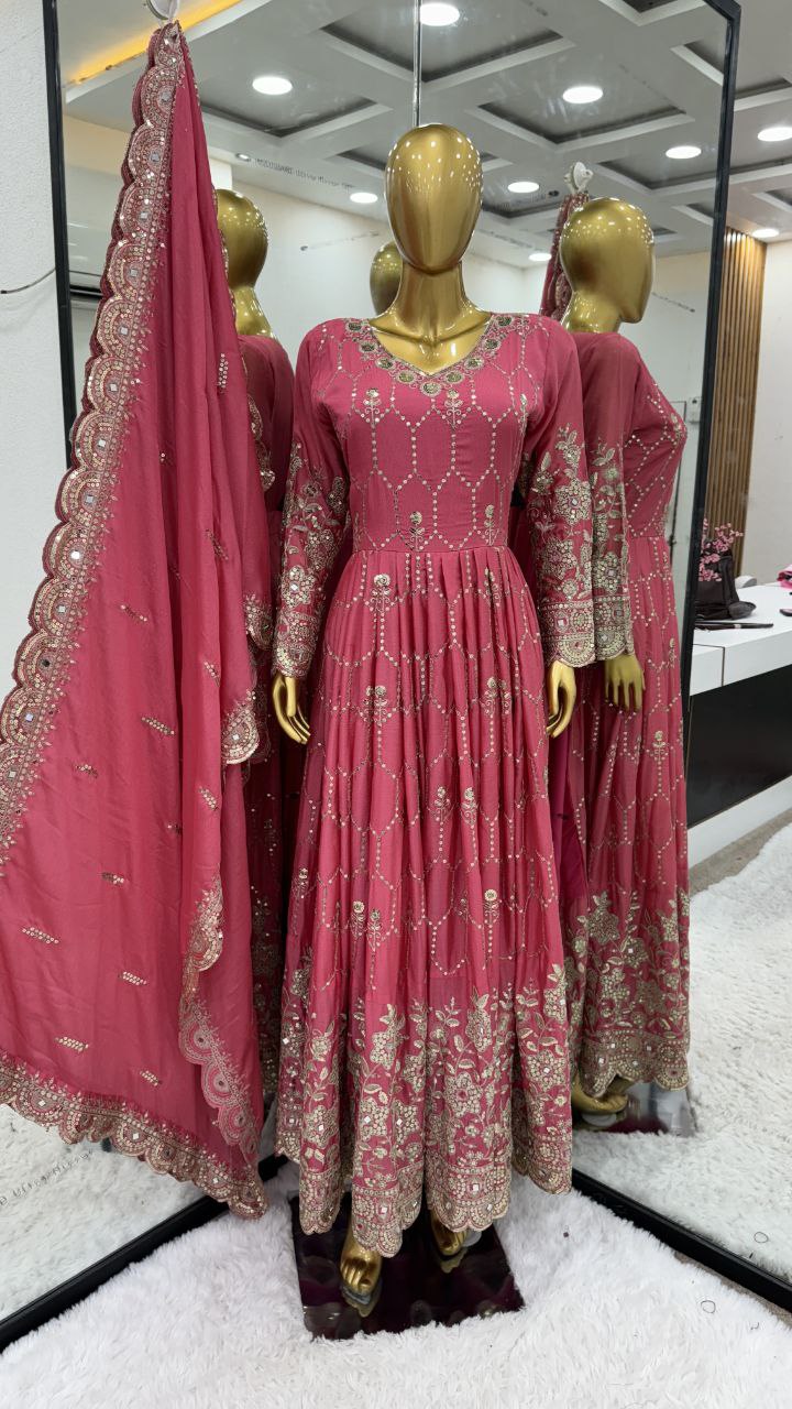 Pure Heavy Chinnon Silk With Full Heavy Embroidery Sequence Work With Real Mirror Hand Work WithFull Sleeve Gown