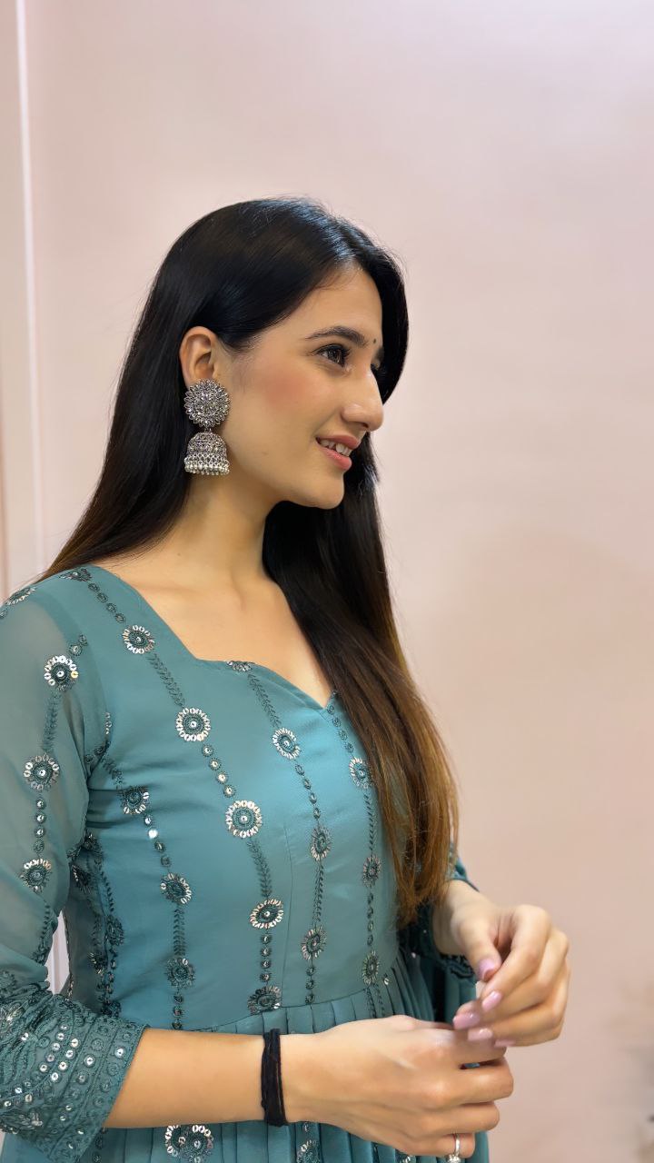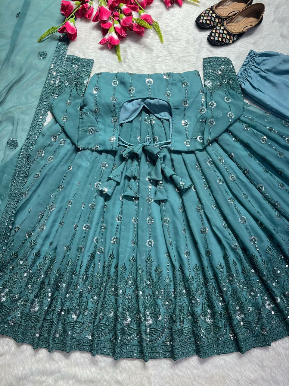 GOWN WORK :-_ SEQUENCE 5MM, MULTI NEEDLE WORK, WITH EMBROIDERY WORK WITH FULL SLEEVE FABRICS DETAIL GOWN FABRIC :-_FOX GEORGETTE WITH EMBROIDERY WORK WITH FULL SLEEVES GOWN INNER : MICRO COTTON PANT FABRIC :- COTTON MATERIAL LENGHT:- 39-40 ( READY MEANT) GOWN SIZE :- (M38)(L40)(42XL)(44XXL)+++Margin Size. (fullstitched) With Cups GOWN LENGTH :-_48-49 INCH GOWN FLAIR :- _3.mtr_ DUPATTA FABRIC : _FOX GEORGETTE WITH SEQUENCE 5MM WORK WITH FOUR SIDE EMBROIDERY LESS BODAR DUPATTA LENGTH:-_2.40mtr