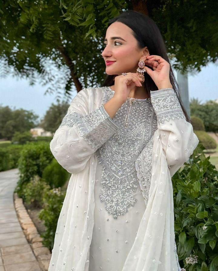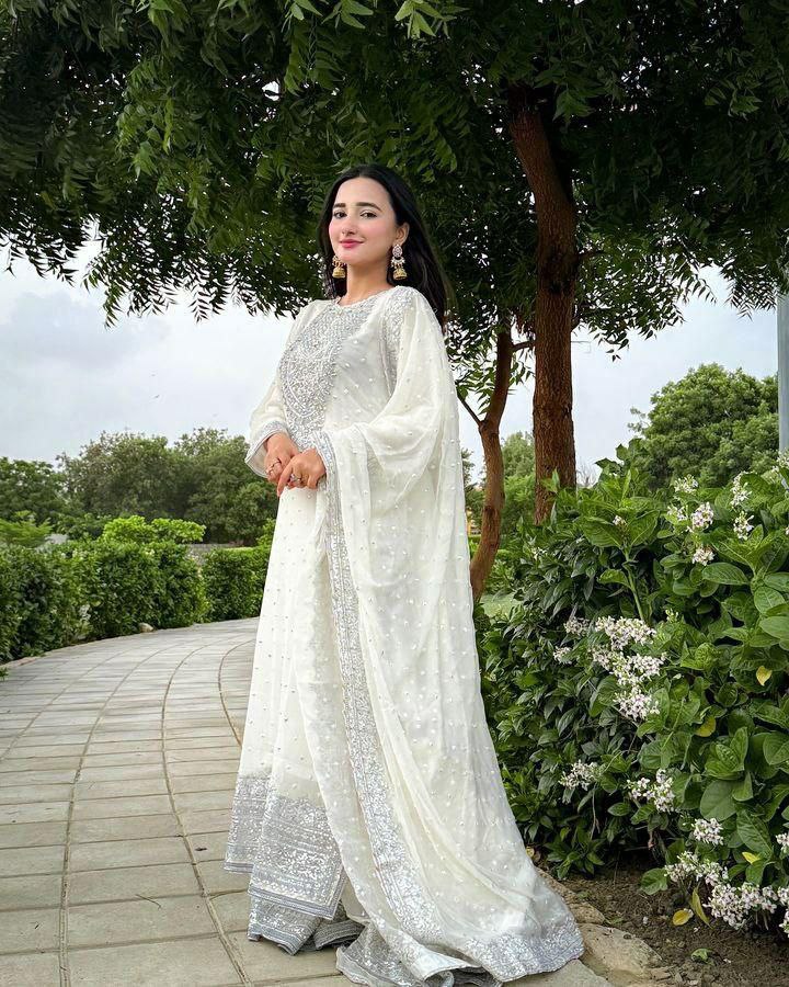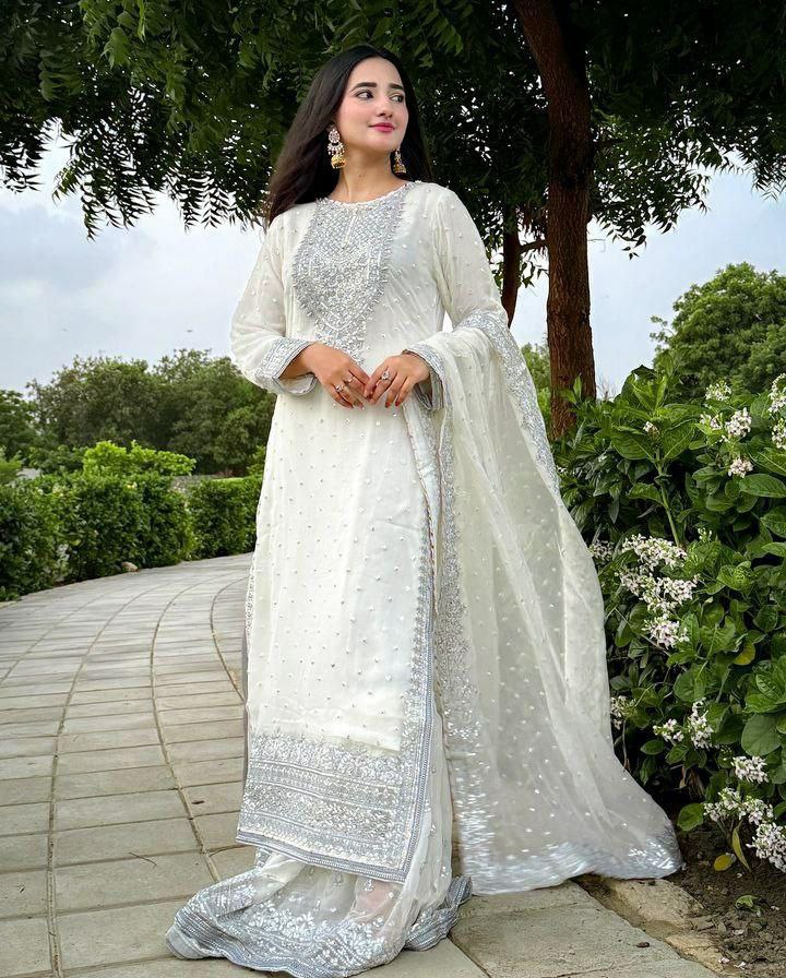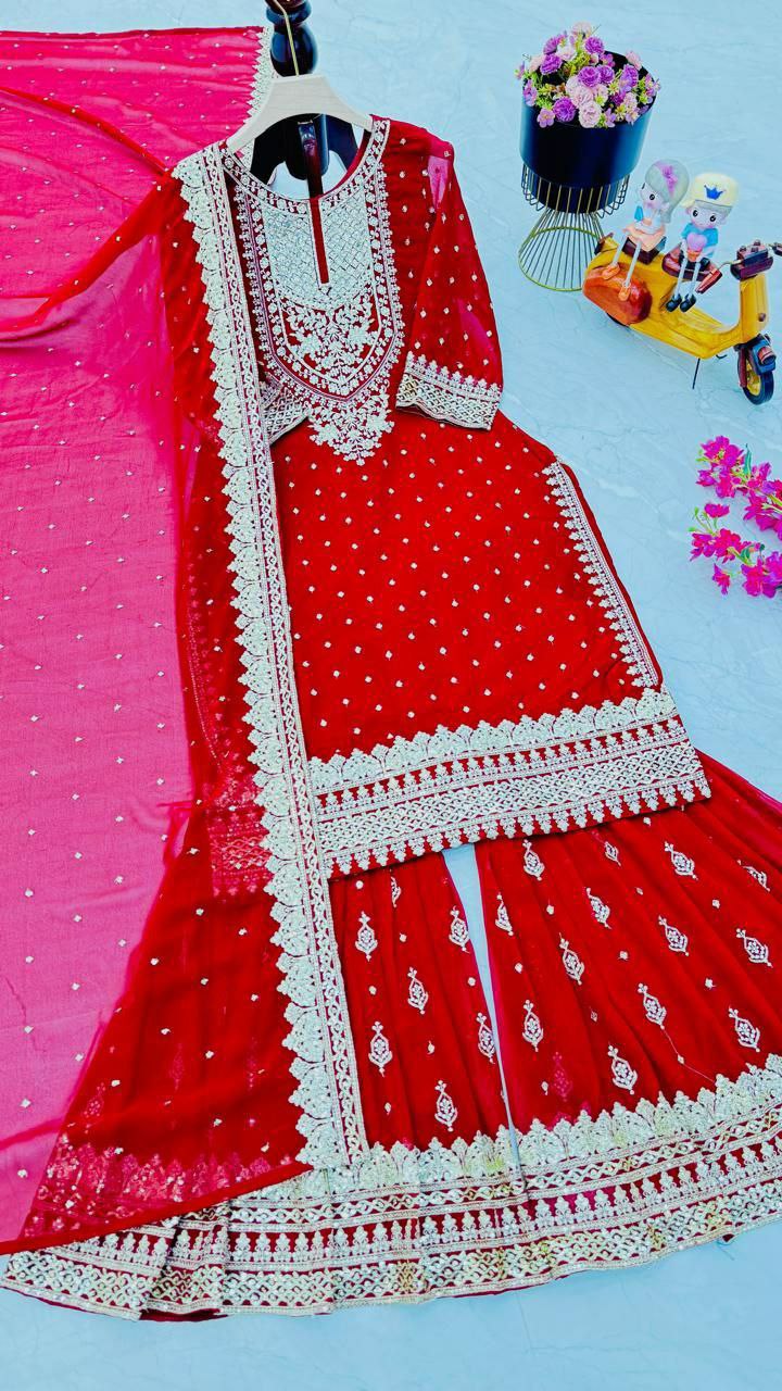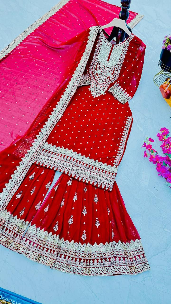 TOP FABRIC : Fox Goegotte INER LINE Micro Silk WORK : Embroidery Siqunce Work SIZE : M/L/XL/XXL LENGTH : 45 NECK : V-Rownd SLEEVES : 20 Inches SHARARA FABRIC : Fox Goegotte INER LINE Micro Silk WORK : Embroidery Siqunce Work SIZE : M/L-40/XL/XXL-44 LENGTH : 42 DUPATTA FABRIC : Fox Goegotte WORK : Embroidery Siqunce Work LENGTH : 2.2 Mtr