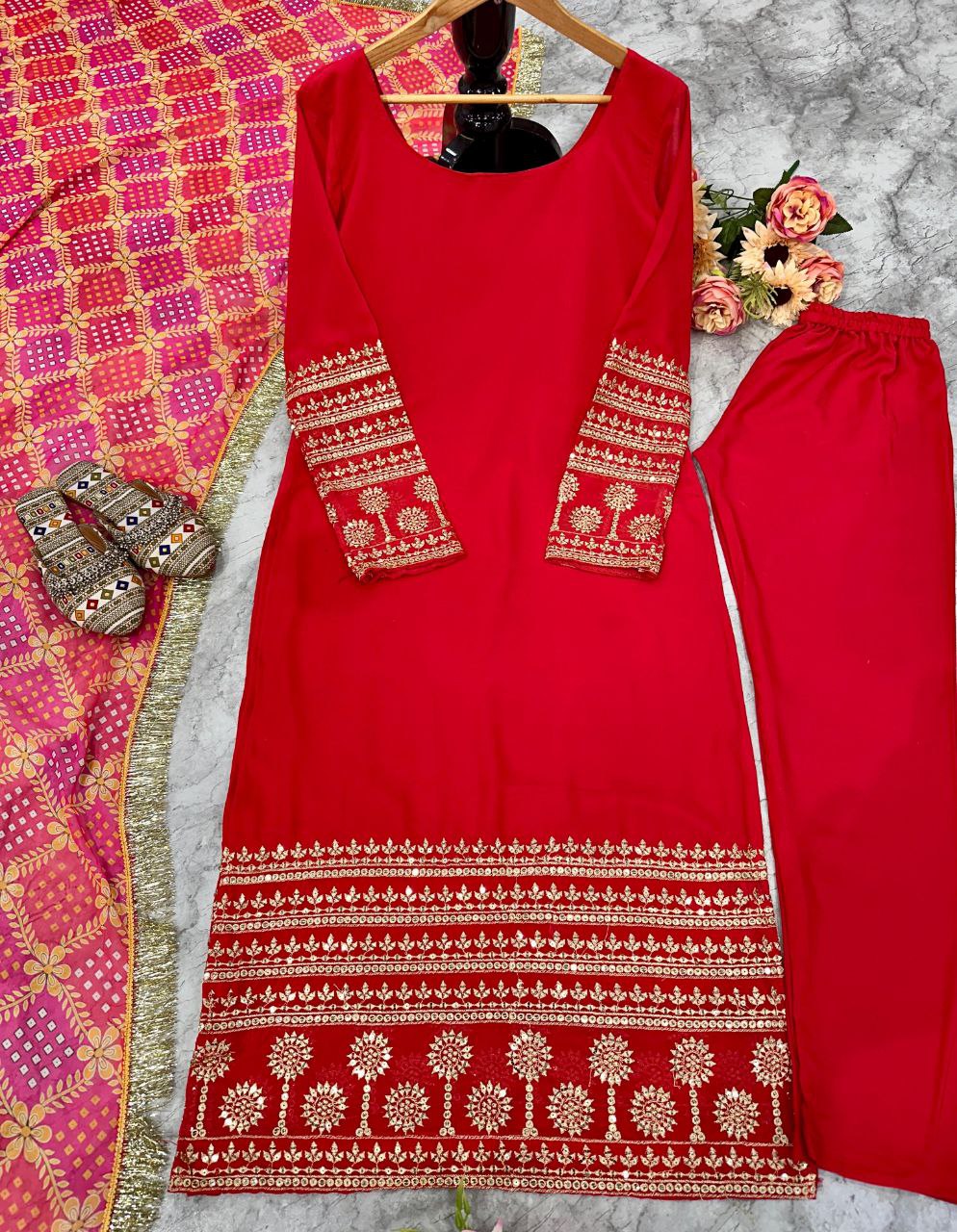 FABRICS DETAIL TOP TOP FABRIC : HAVY FOUX GOARGATE WITH HAVY EMBRODAY WORK RED KURTI TOP INAR : MICRO COTTON TOP LANGTH :48-INCH TOP SIZE. :M(38),L(40),XL(42),XXL(44) (FULL STICHED ) BOTTOM- BOTTOM FABRICS : HAVY MICRO COTTAN WITH ELASTIC BOTTOM LENGTH : 40-INC (FULL STICHED ) DUPATTA DUPATTA FABRICS : HAVY FOUX GOARGATE WITH DIGITAL PRINT AND LACE WORK DUPATTA LENGTH : 2.2MTR