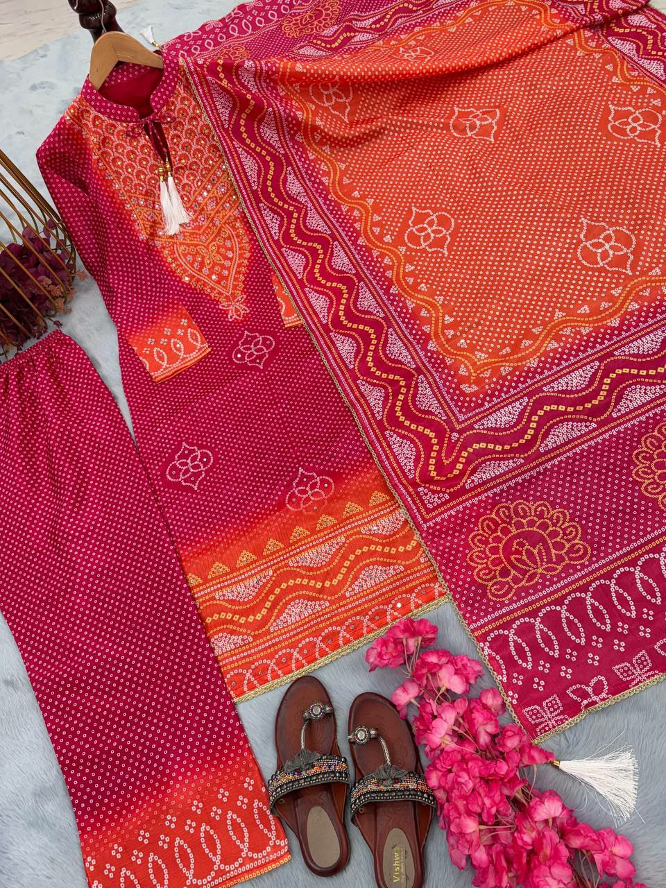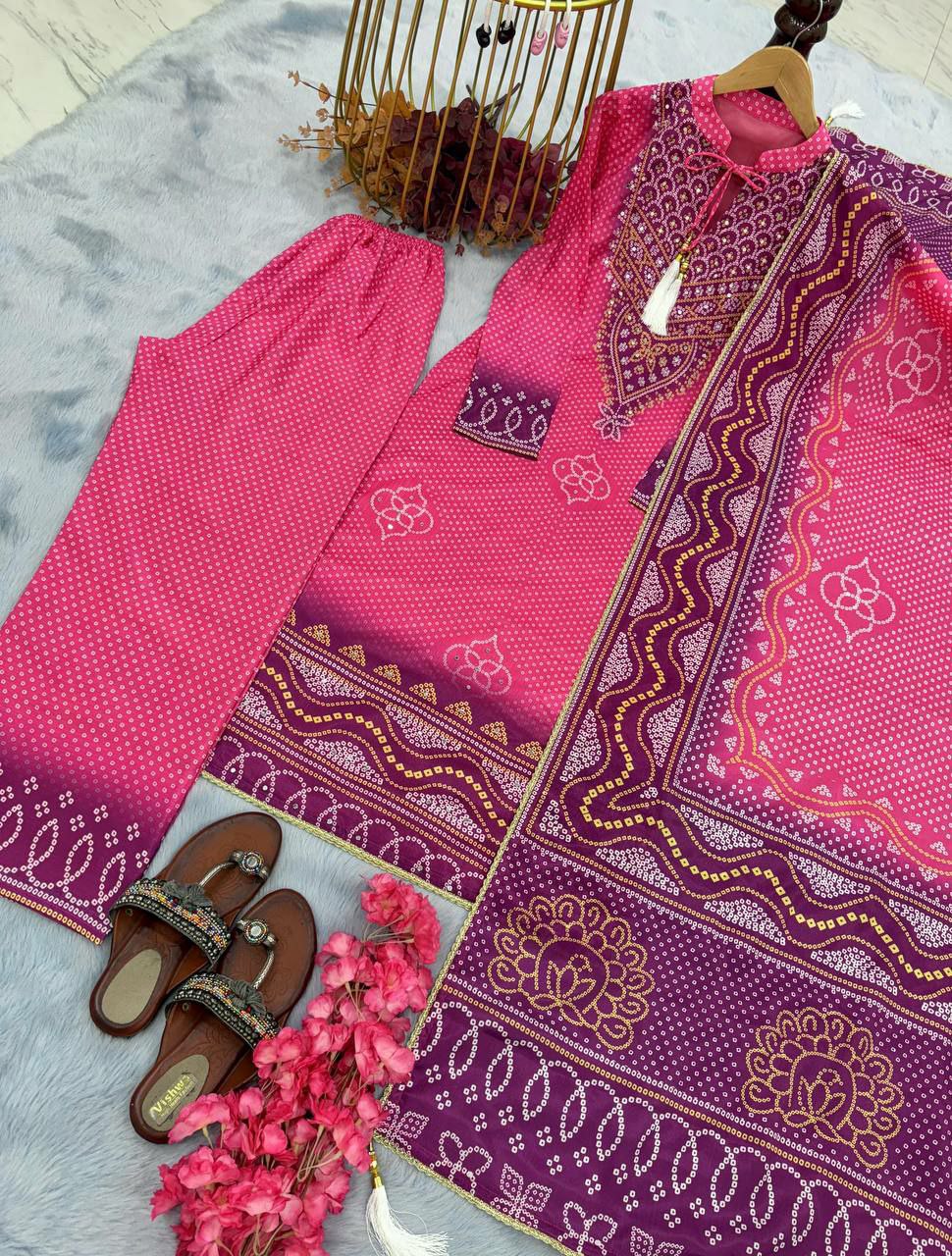 Heavy Chinon Silk With Digital Print With Riyal Mirror Hand Work With Sleeves With Tassels & Latkan