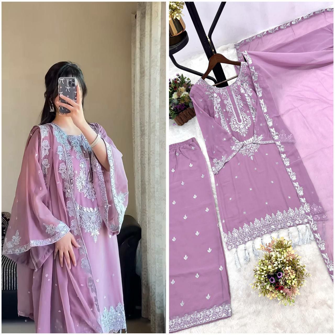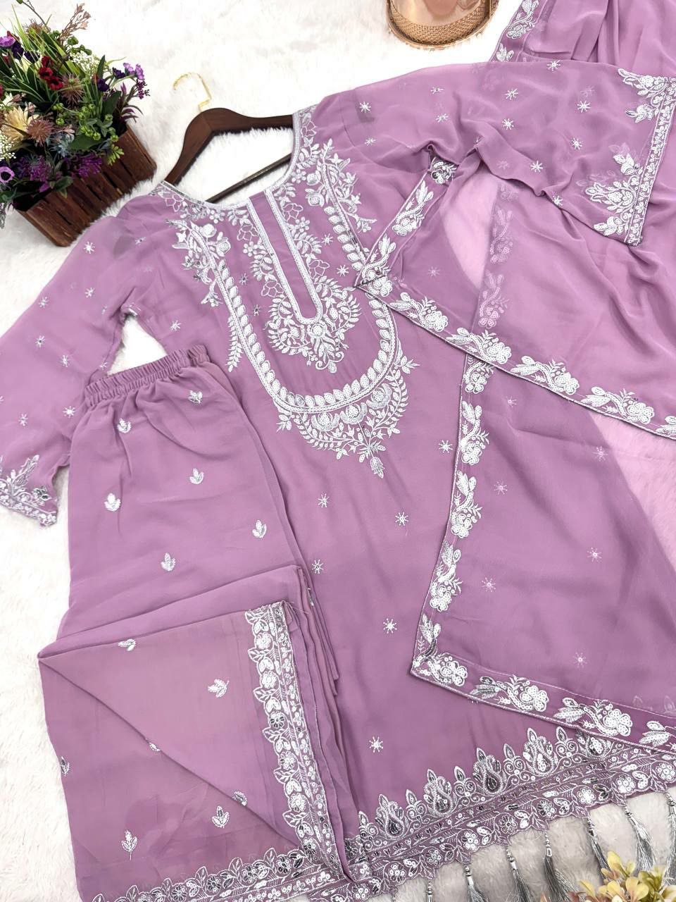 HEAVY FAUX GEORGETTE AND BEAUTIFUL EMBROIDERY SEQUENCE WORK PALAZZO KURTI
