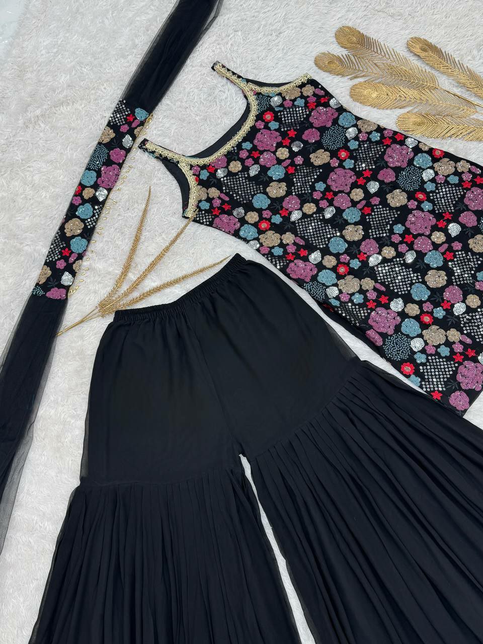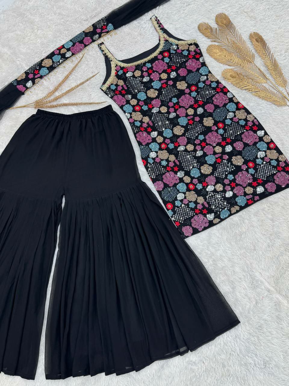 HEAVY FAUX GEPRGETTE WITH ATTRACTIVE & BEAUTIFUL EMBROIDERY SEQUENCE WORK SHARARA KURTI