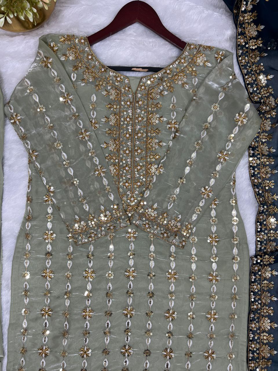 HEAVY JIMMY CHU SILK. WORK:- BEAUTIFUL 5 MM EMBROIDERY SEQUENCE AND THREAD WORK KURTI SET