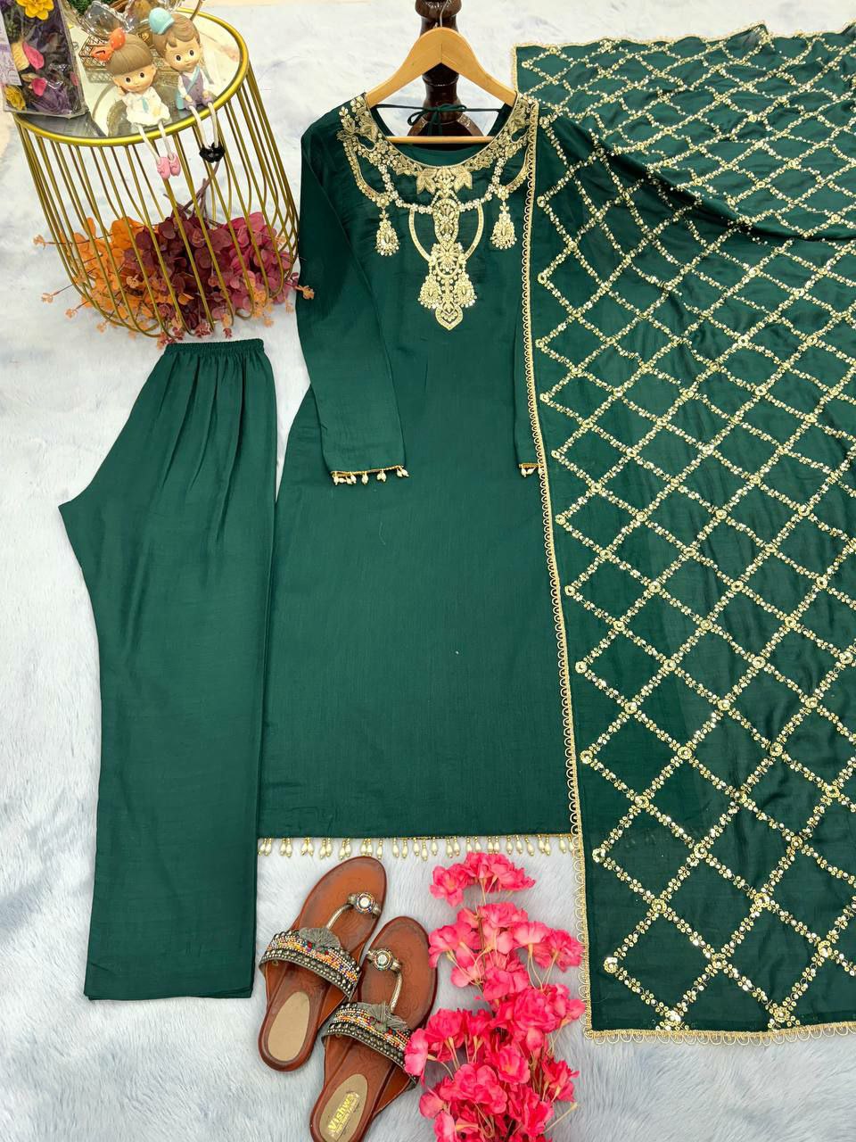 Top Fabric: Heavy Pur Slub Silk With Embroidery 5 mm Sequence Work With Rivet Moti Work With Full Sleeve With Fancy Latkan Kurti  Top Inner :Micro Cotton Top Length : 45-46 Inch Top Size : M(38) L(40) XL(42) XXL(44) Fully stitched Bottom Fabric :Heavy Pur Slub Silk With Elastic Bottom Inner : Micro Cotton Bottom Length 39 Inch (Full Stitched) Dupatta Fabric : Heavy Pur Slub Silk With Embroidery 5 mm Sequence Work With Rivet Moti Work With Four Side Fancy Lace Border Dupatta Length: 2.20 Mtr