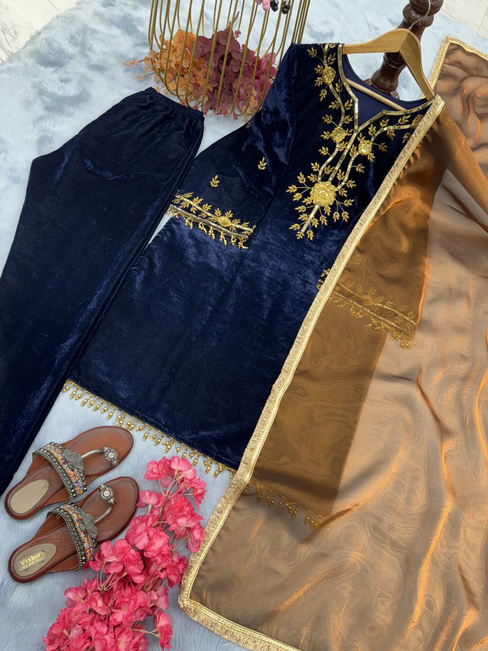 Heavy Pure Viscose Velvet With Embroidery 5 mm Sequence Work With Fancy Latkan With Fancy Bell Sleeve Kurti Set