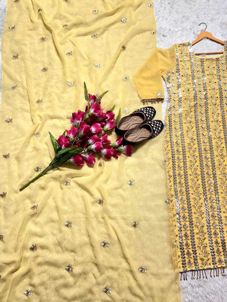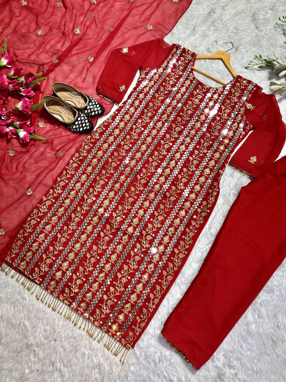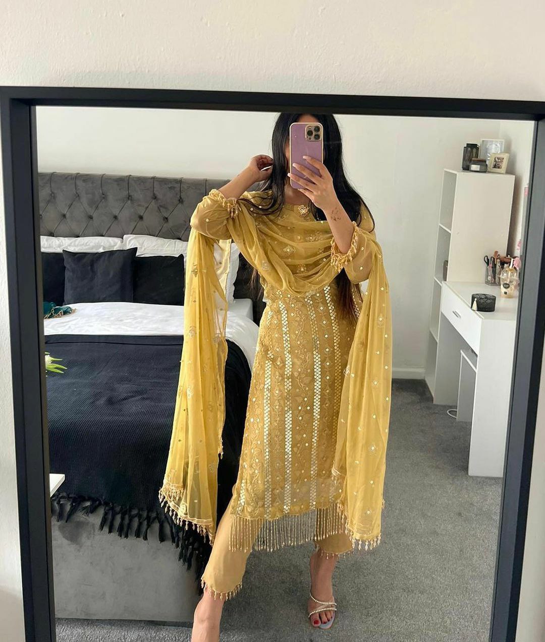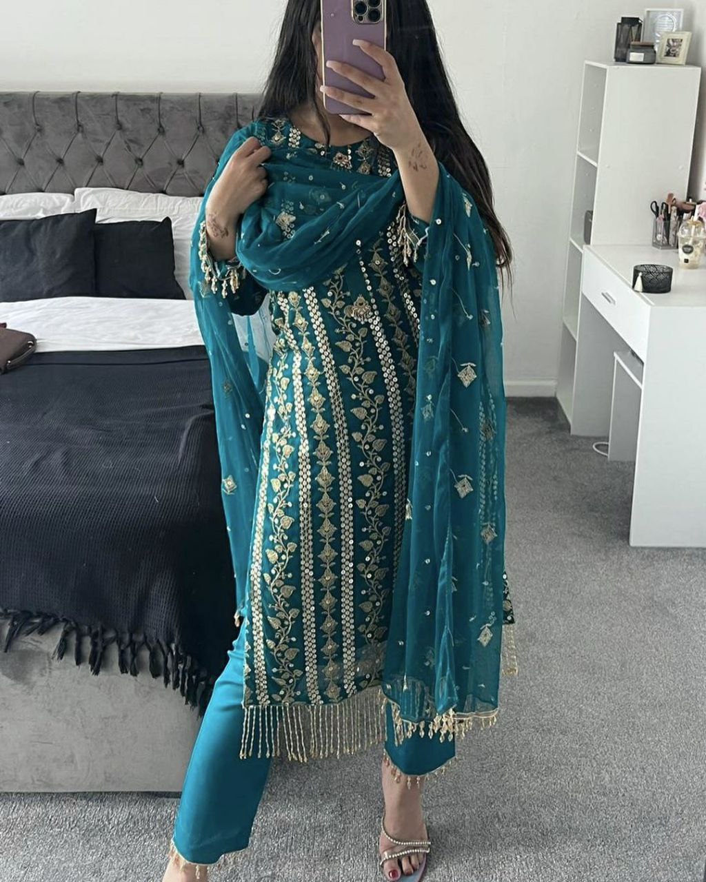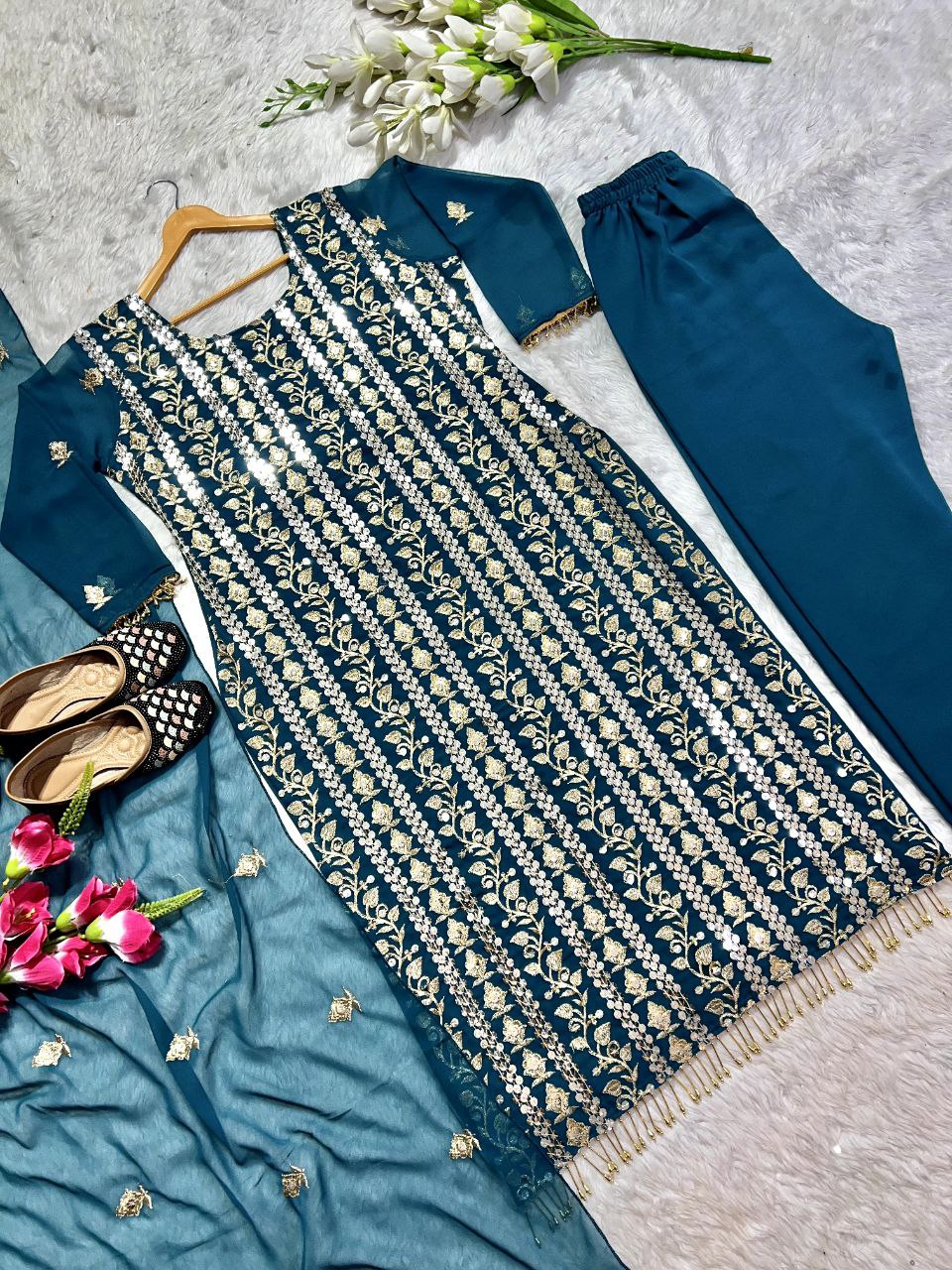 Long Top Fabri :- Hevay Faux Georgette Fabric With Heavy Embroidery 9mm Sequence Work With Moti Latkan Less . (Fully Sleeve’s) Long Top inner :- Heavy Micro Cotton Long Top Length :- 46-47Inch Long Top Size :- M(38), L(40),XL(42),2XL(44) Pant Fabric : Micro Cotton With Ready-Made Moti Latakan Less . Pant Inner :- Heavy Micro Cotton Pant Length :- 40-42 Inch ( Fully Stitched) Dupptta :- Heavy Faux Georgette Material With Heavy Embroidery 9mm Sequence Work Cut Work Less Border ( Dupptta Length 2.40 Mtr )