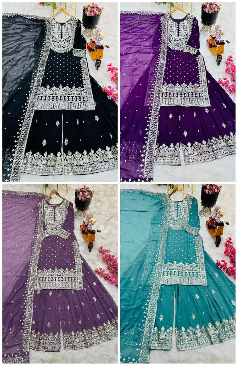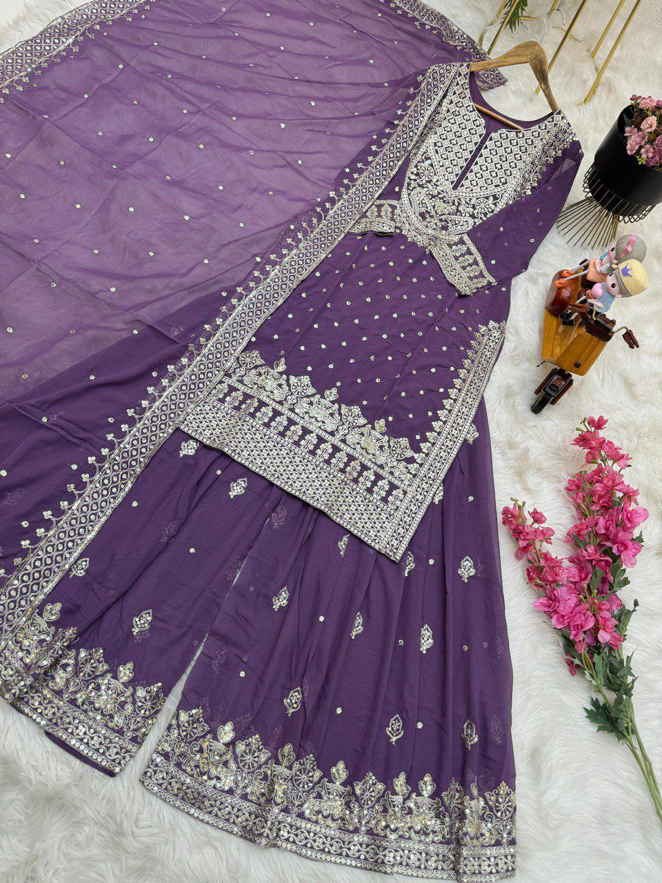 TOP FABRIC-: Fox Goegotte INER LINE : Micro Silk WORK : Embroidery Siqunce Work SIZE : M/L/XL/XXL LENGTH : 45 NECK : V-Rownd SLEEVES: 20 Inches SHARARA FABRIC : Fox Goegotte INER LINE Micro Silk WORK : Embroidery Siqunce Work SIZE : M/L-40/XL/XXL-44 LENGTH-: 42 DUPATTA FABRIC : Fox Goegotte WORK : Embroidery Siqunce Work LENGTH-: 2.2 Mtr (FULLY STITCHED )
