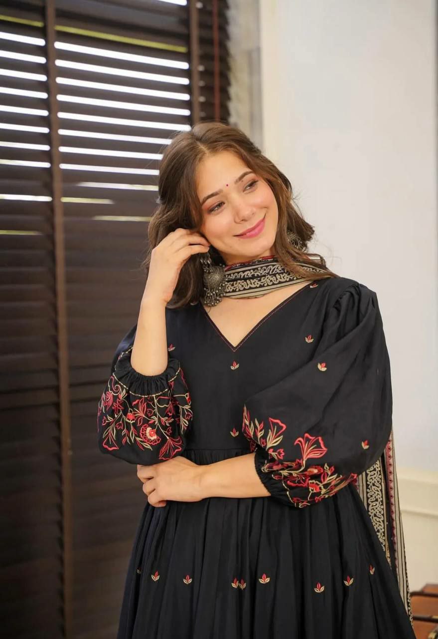 Pure Chinnon Silk With Embroidery Work With Fancy Full Sleeve Round Kurti
